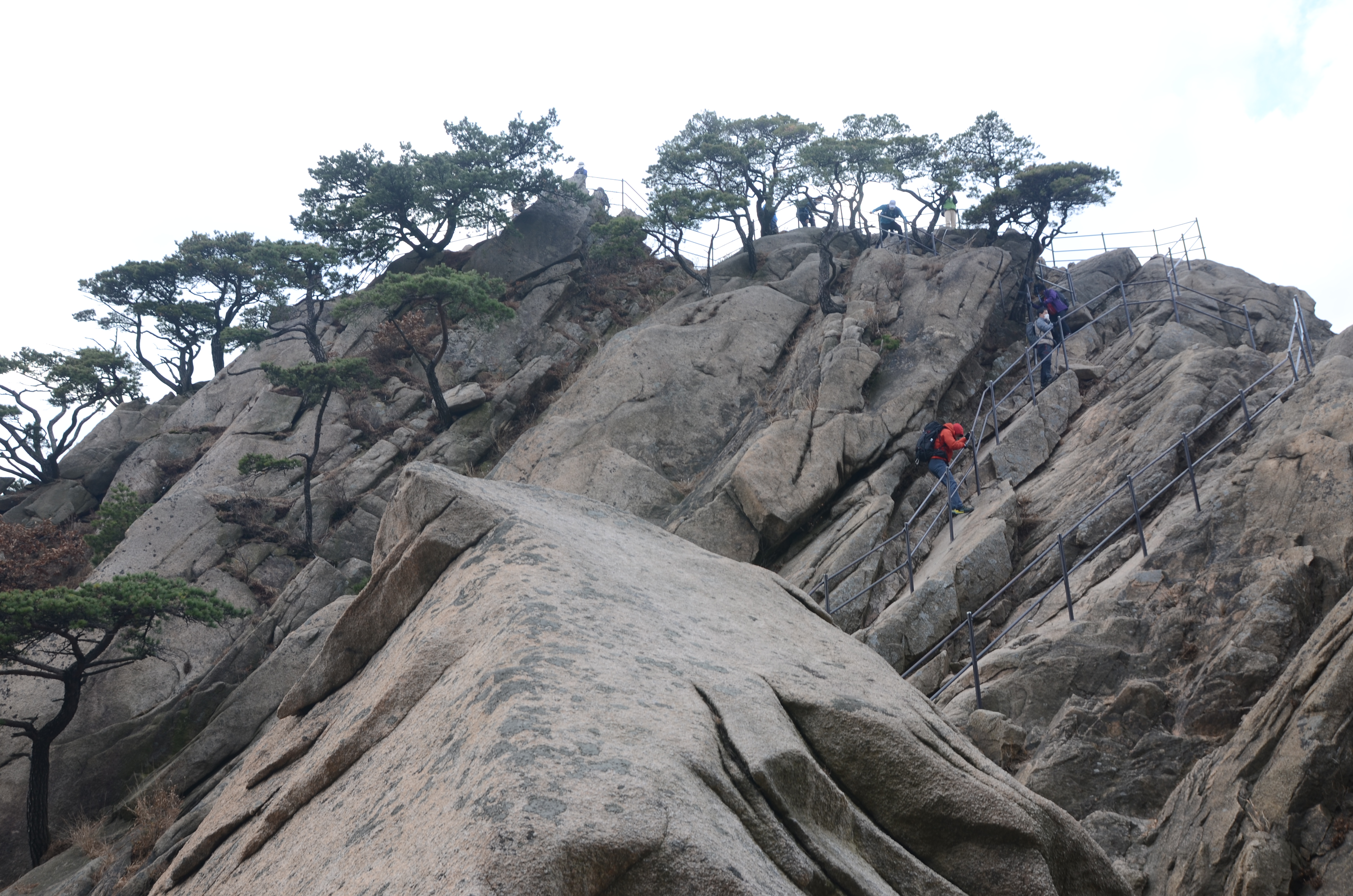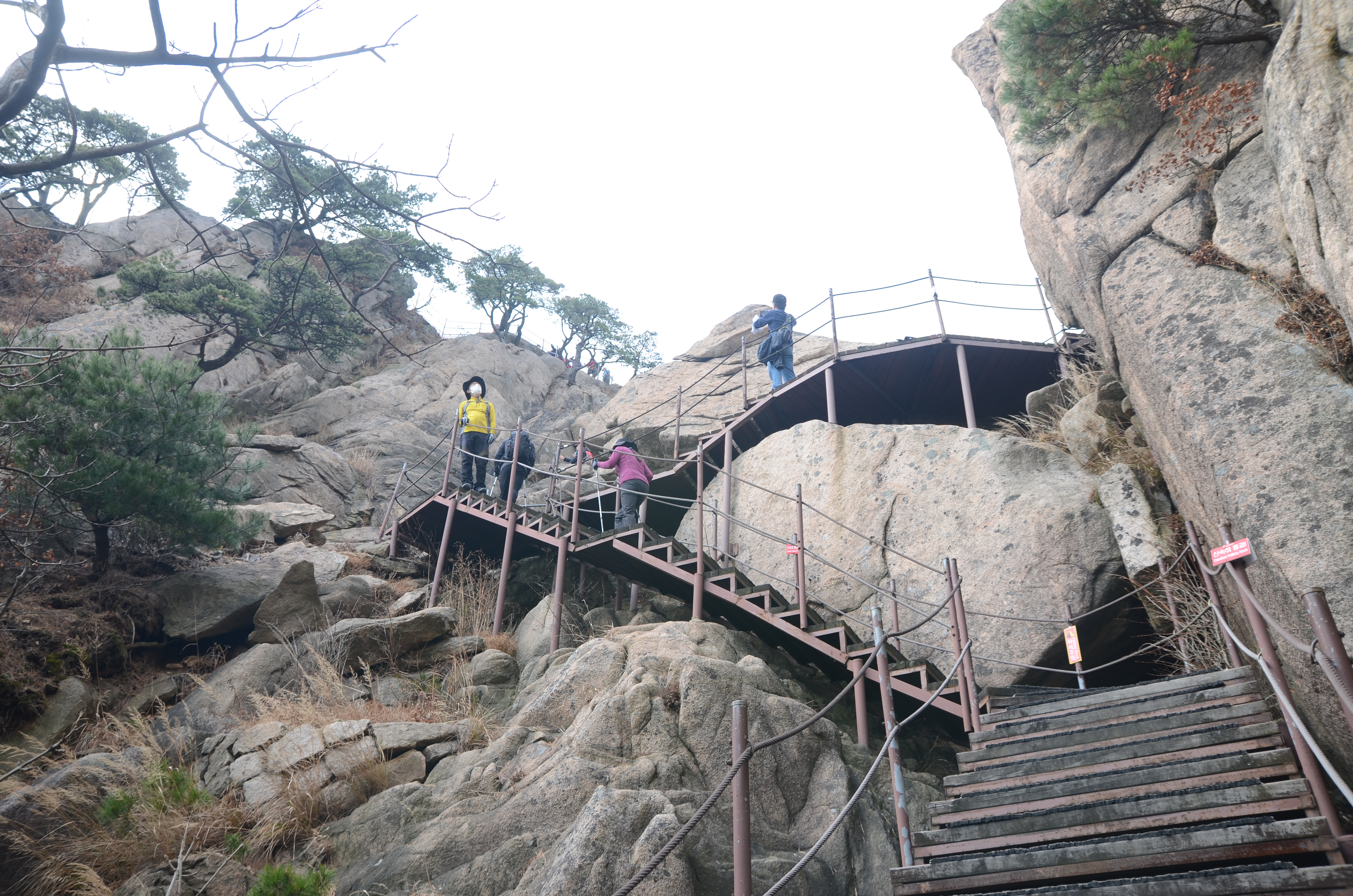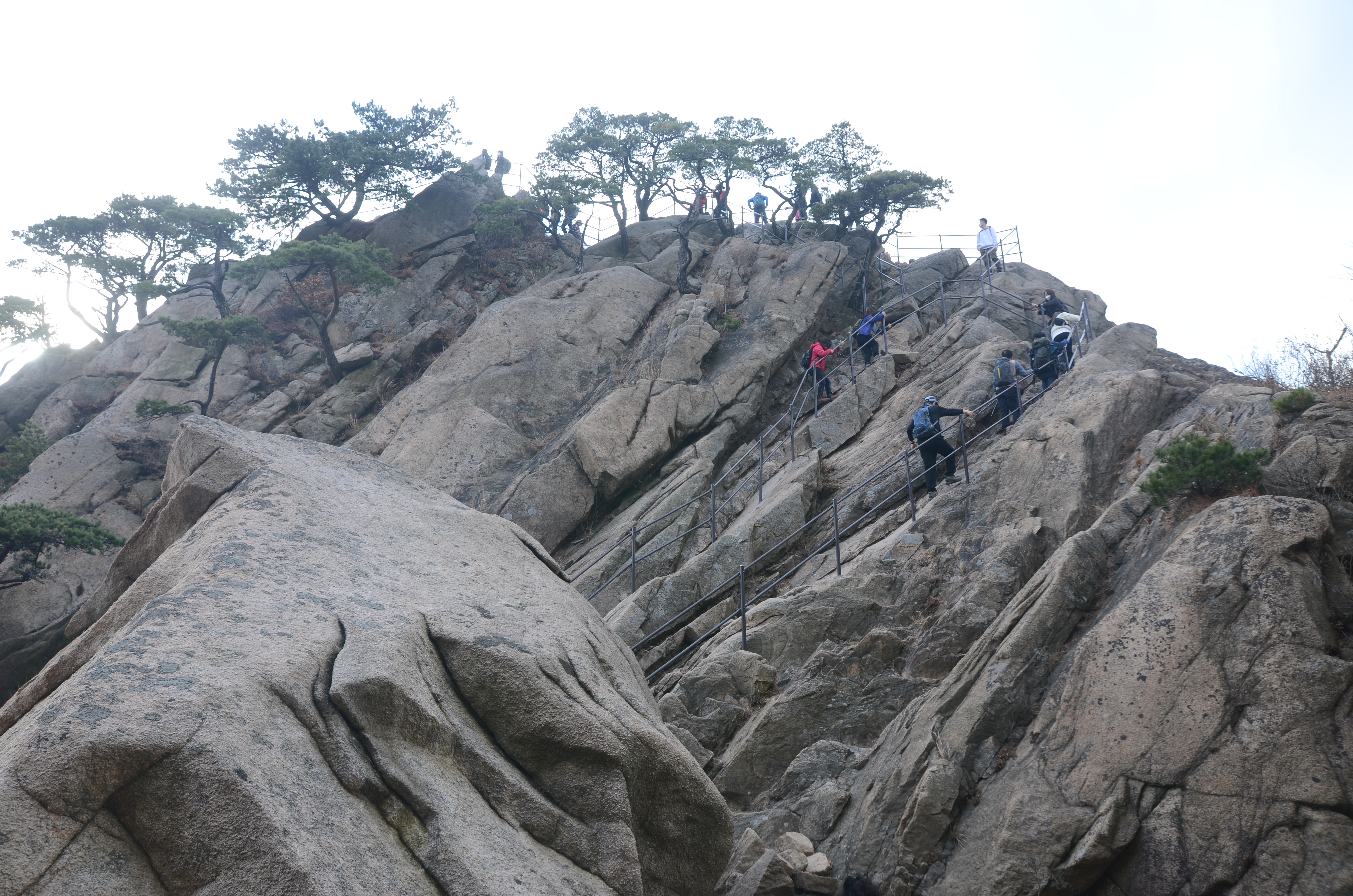 쇠난간을 잡고 신선대를 오르내리는 사람들