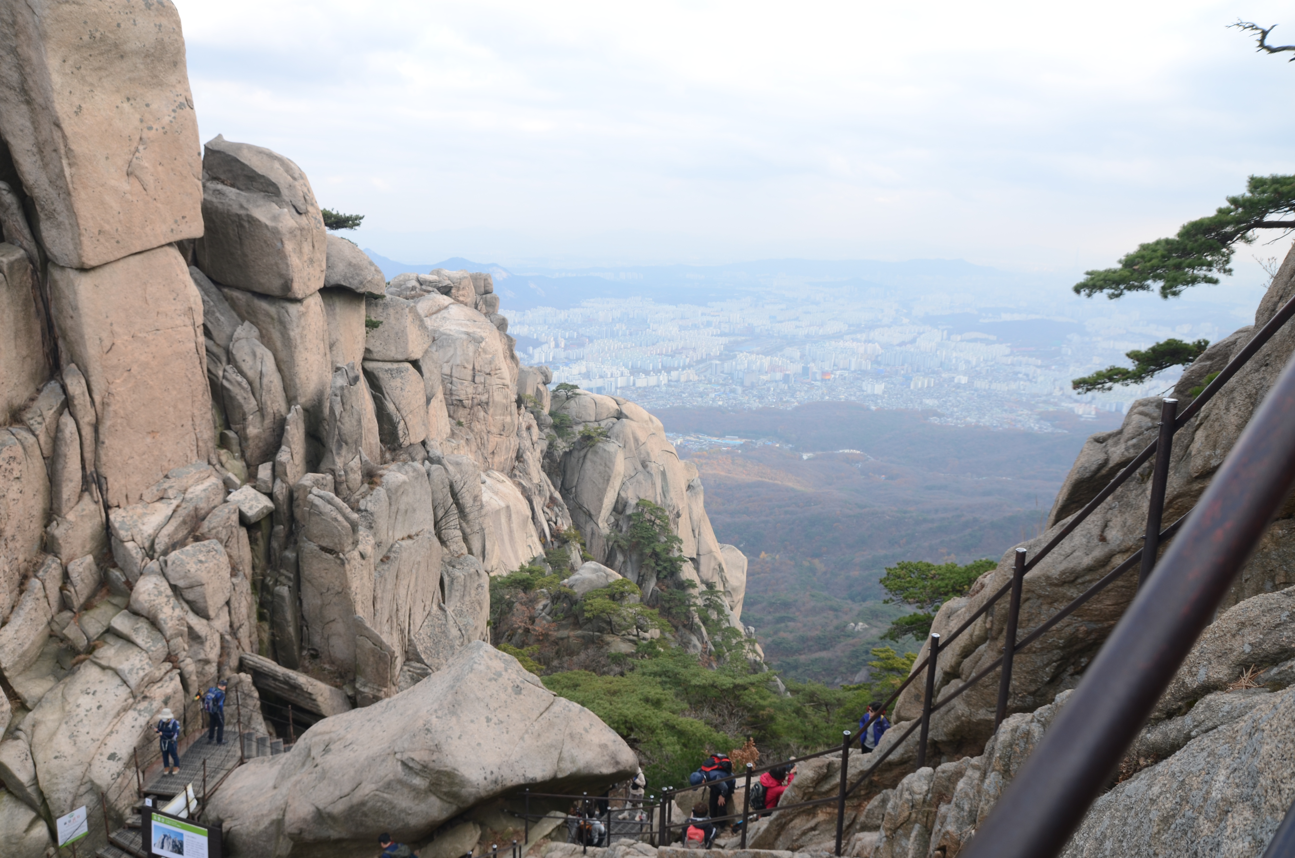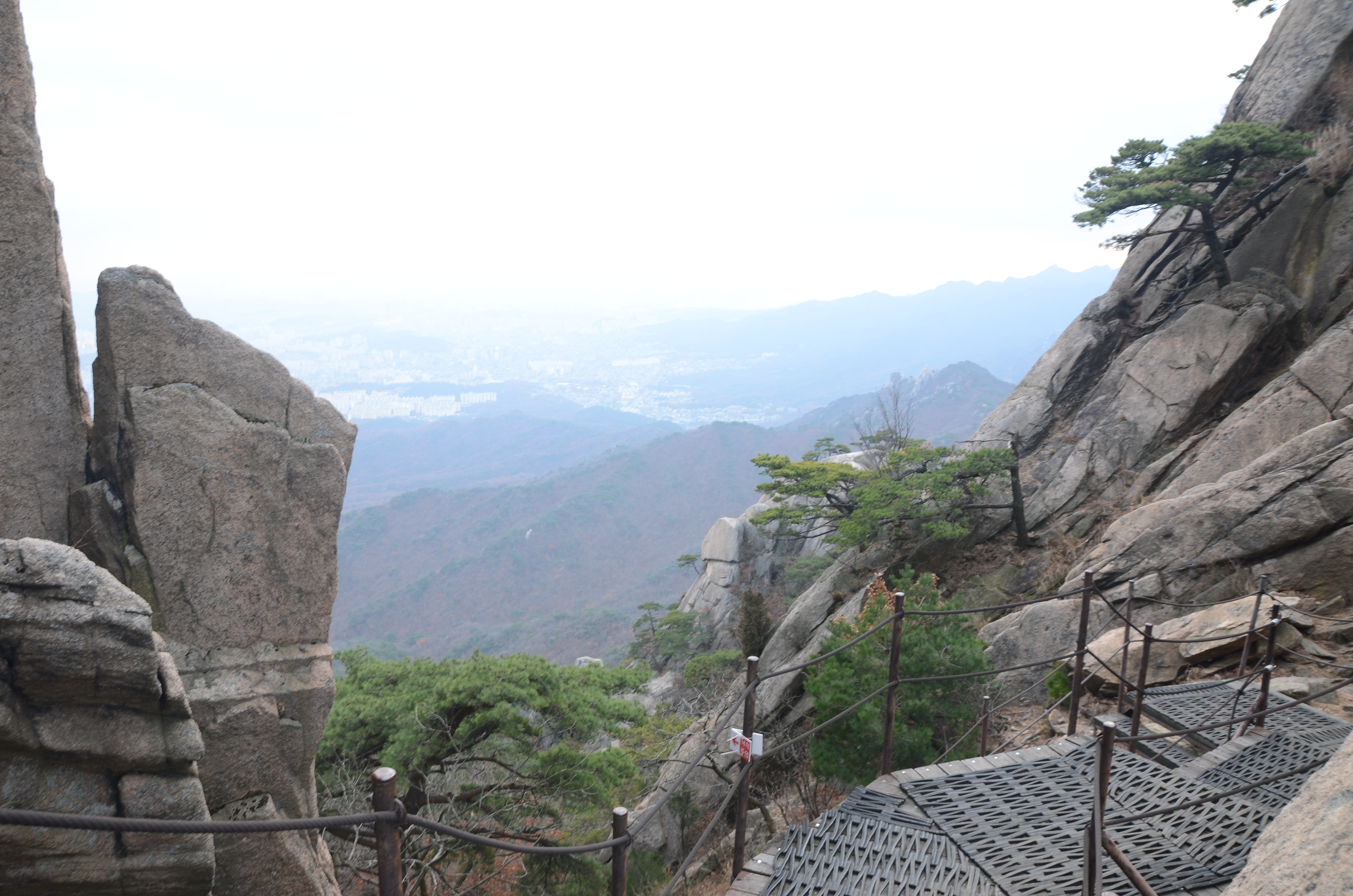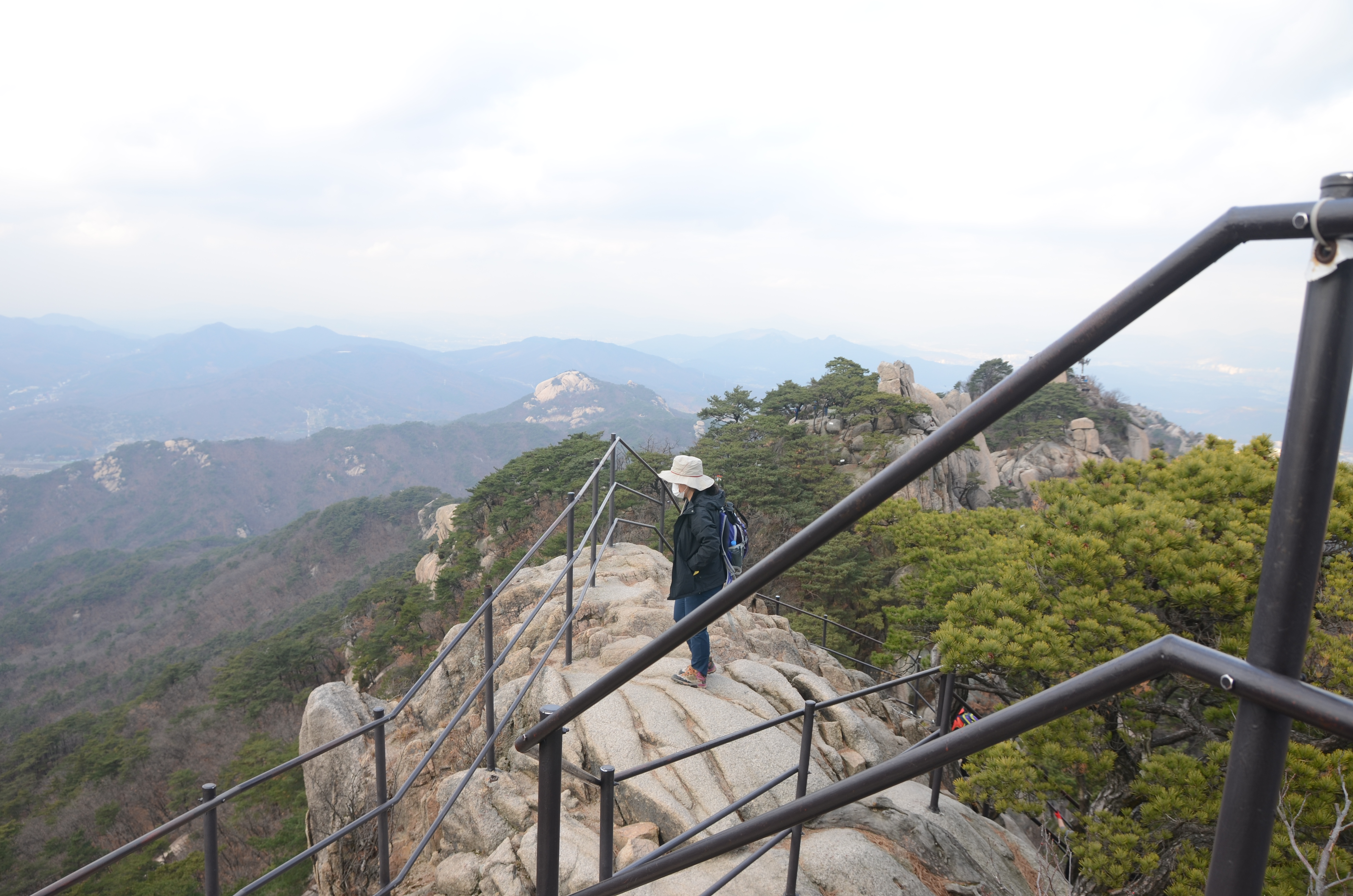 쇠난간을 잡고 신선대를 오르내리는 사람들