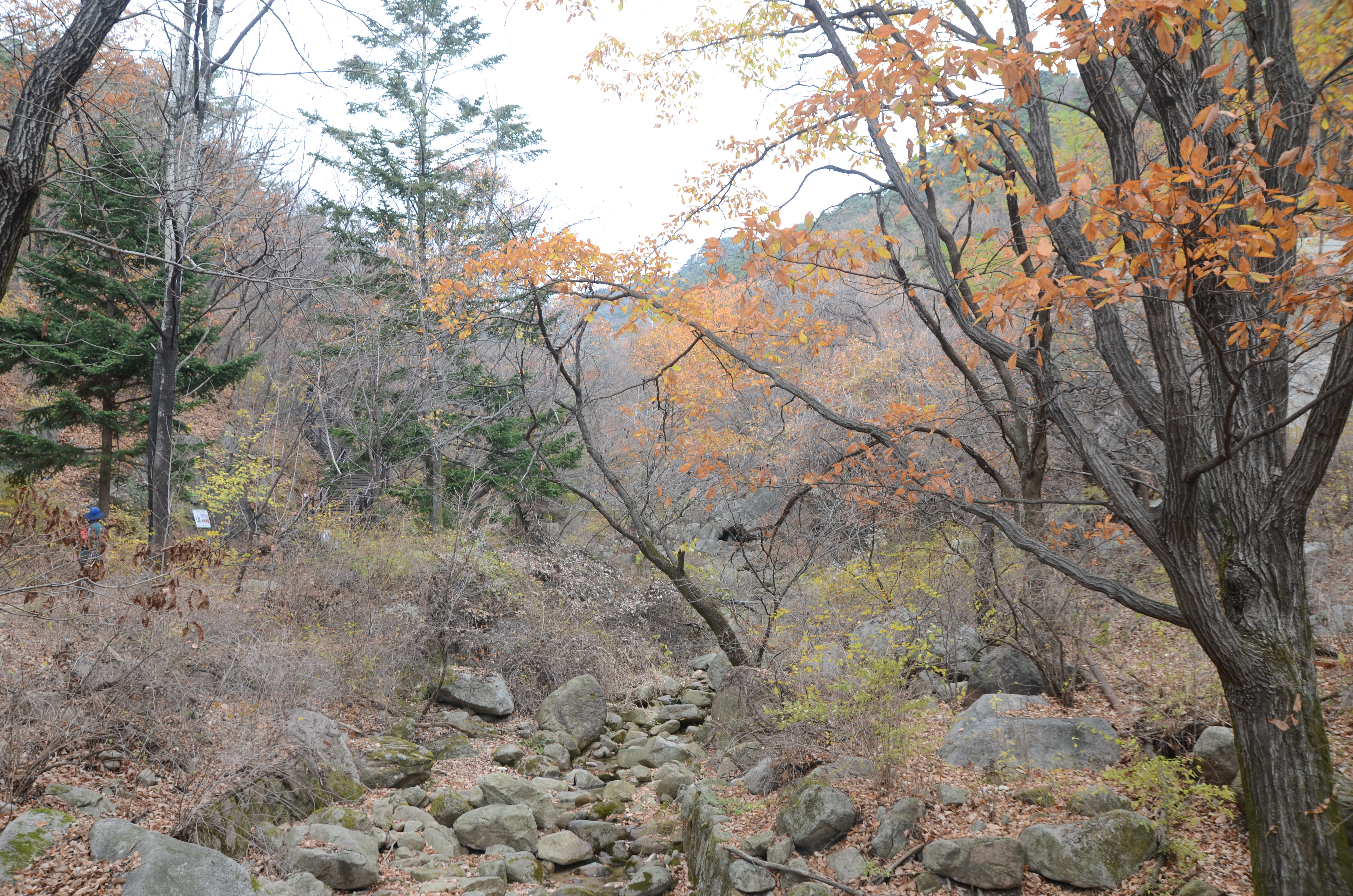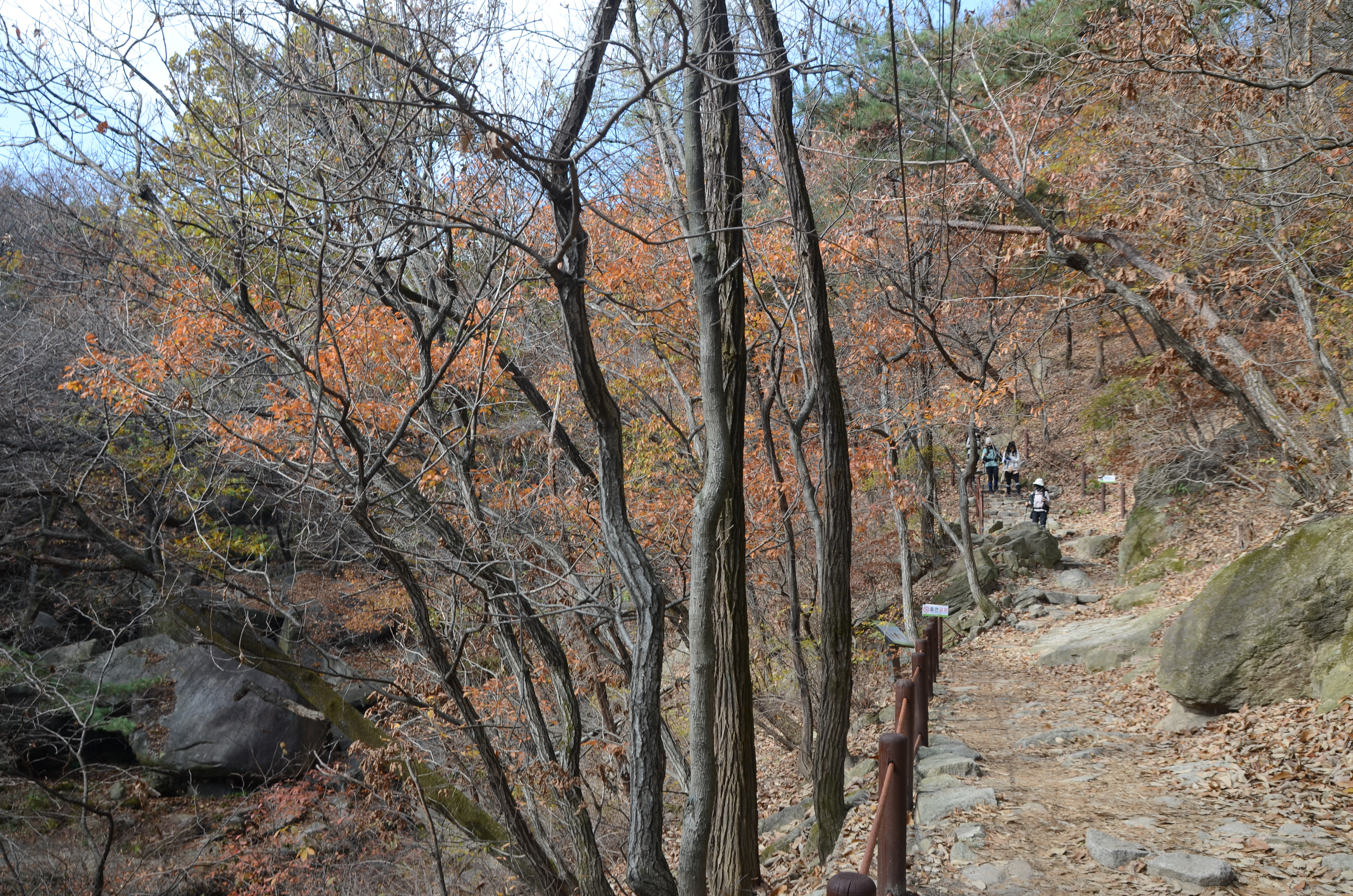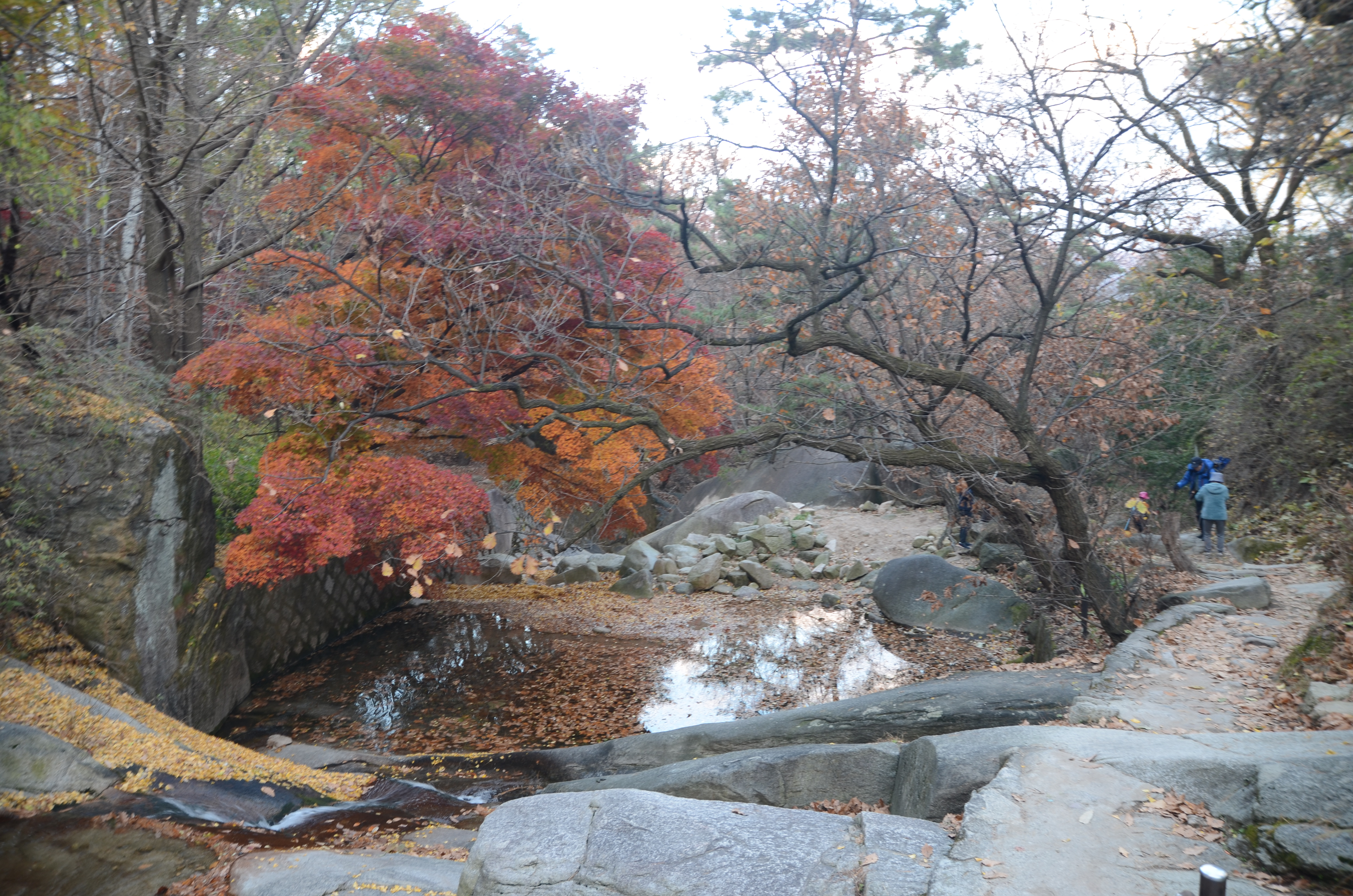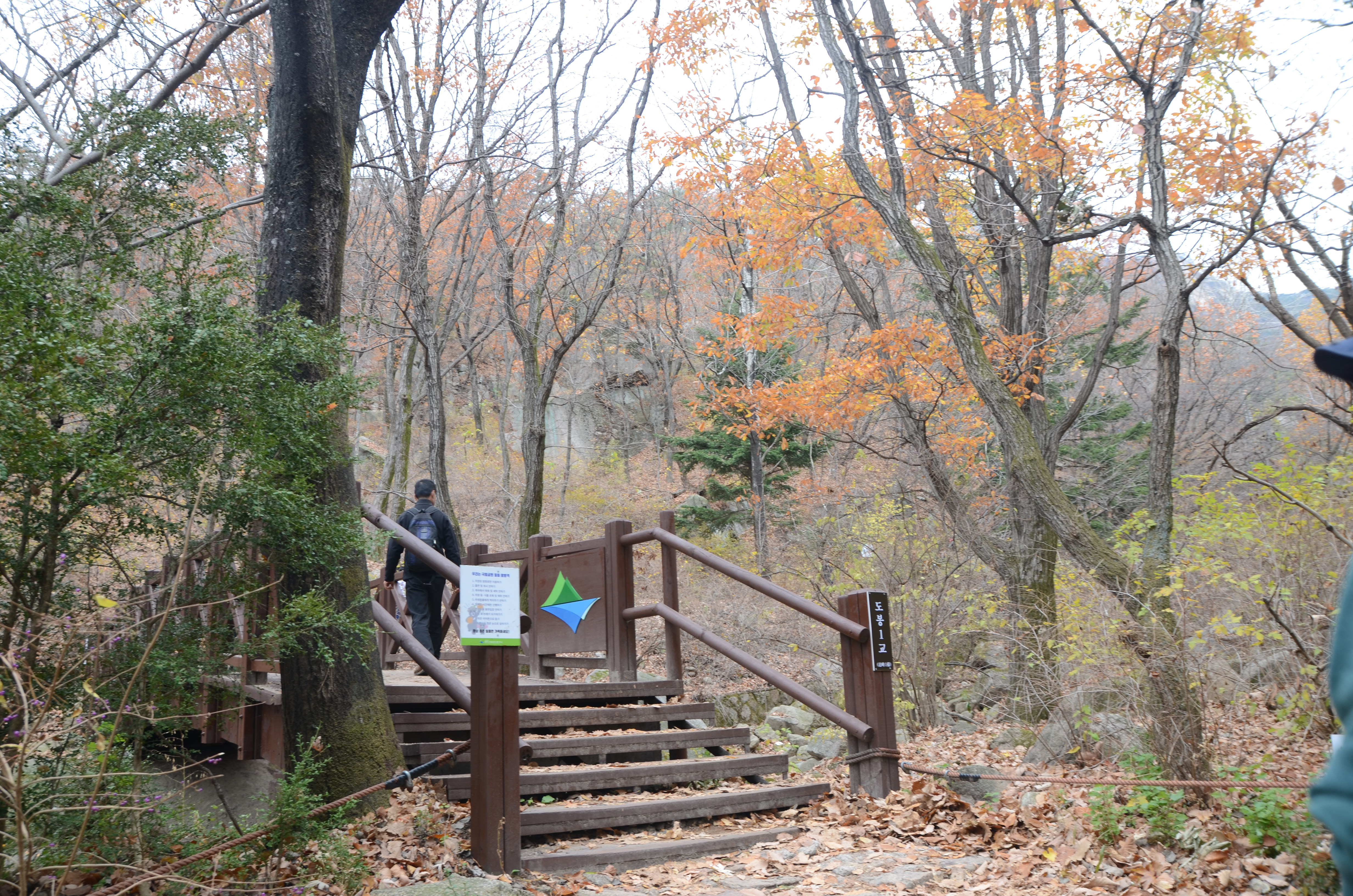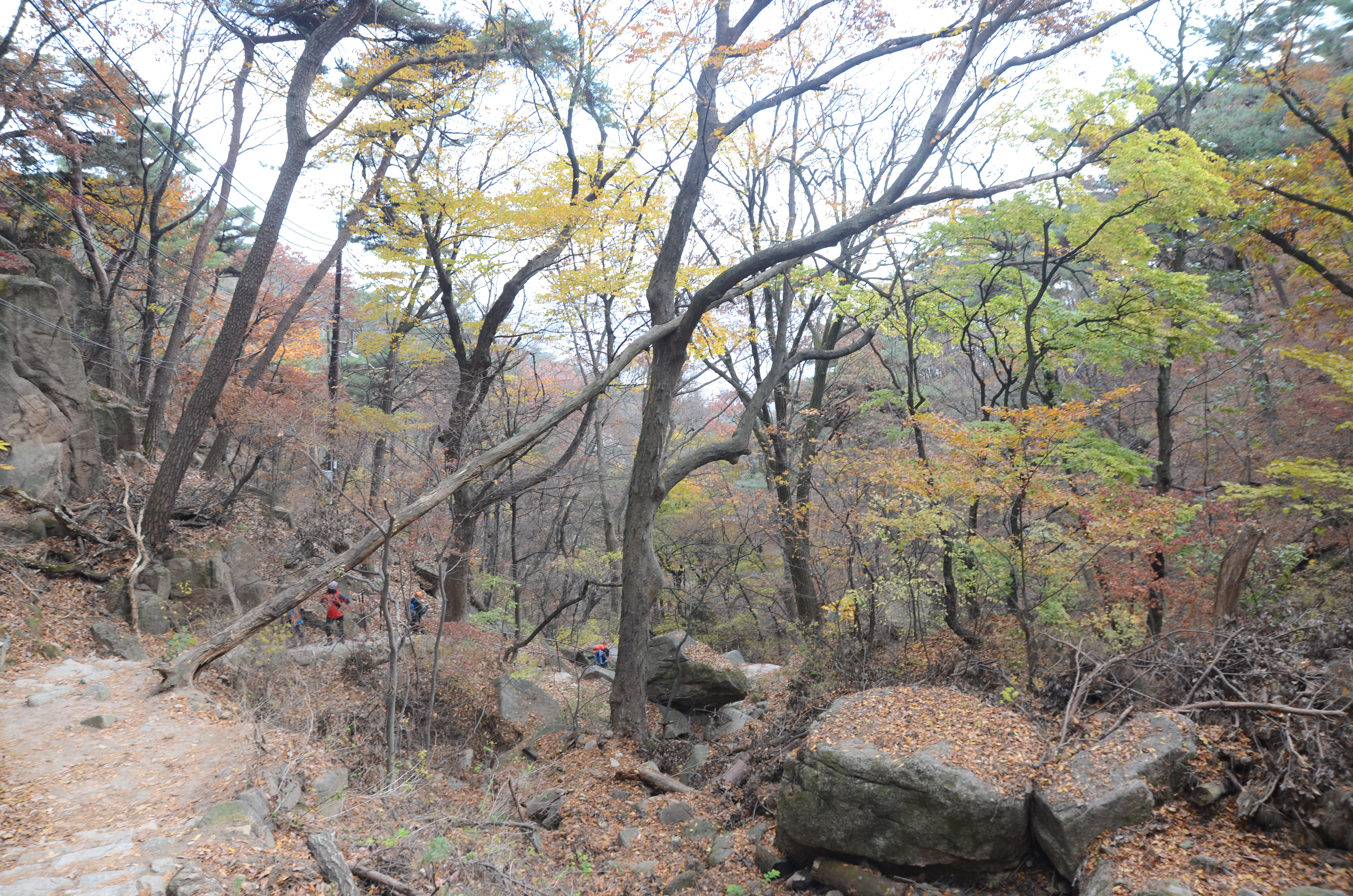 내려 갈 때는 천축사 방향 대신 오른쪽 능선길로 하산하려 하였습니다. 이 길은 흙길로 걷기에 좋습니다. 그런데, 이길로 하산하는 사람이 없었습니다. 마당바위에서 0.4km 정도 하산하니 성도원 이정표가 나옵니다. 원래 능선길은 왼쪽 능선 방향으로 계속 진행해야 하는데 이정표가 없습니다. 시간은 촉박한데, 확실한 길을 선택하기로 합니다. 그래서 성도원 코스를 택해 하산하게 되었습니다. 성도원 입구를 지나 계곡길이 계속되는데 걷기도 좋고 우이암 방향에서 내려오는 산객들도 있어 좋았습니다. 나중 구봉사 절 계곡에서는 짙은 단풍에 감탄하기도 했습니다. 처음의 도봉산탐방지원센터에 도착하니 5:29분이었으며 날이 저물고 있었습니다. 오늘 도봉산 산행 만점이었습니다.
