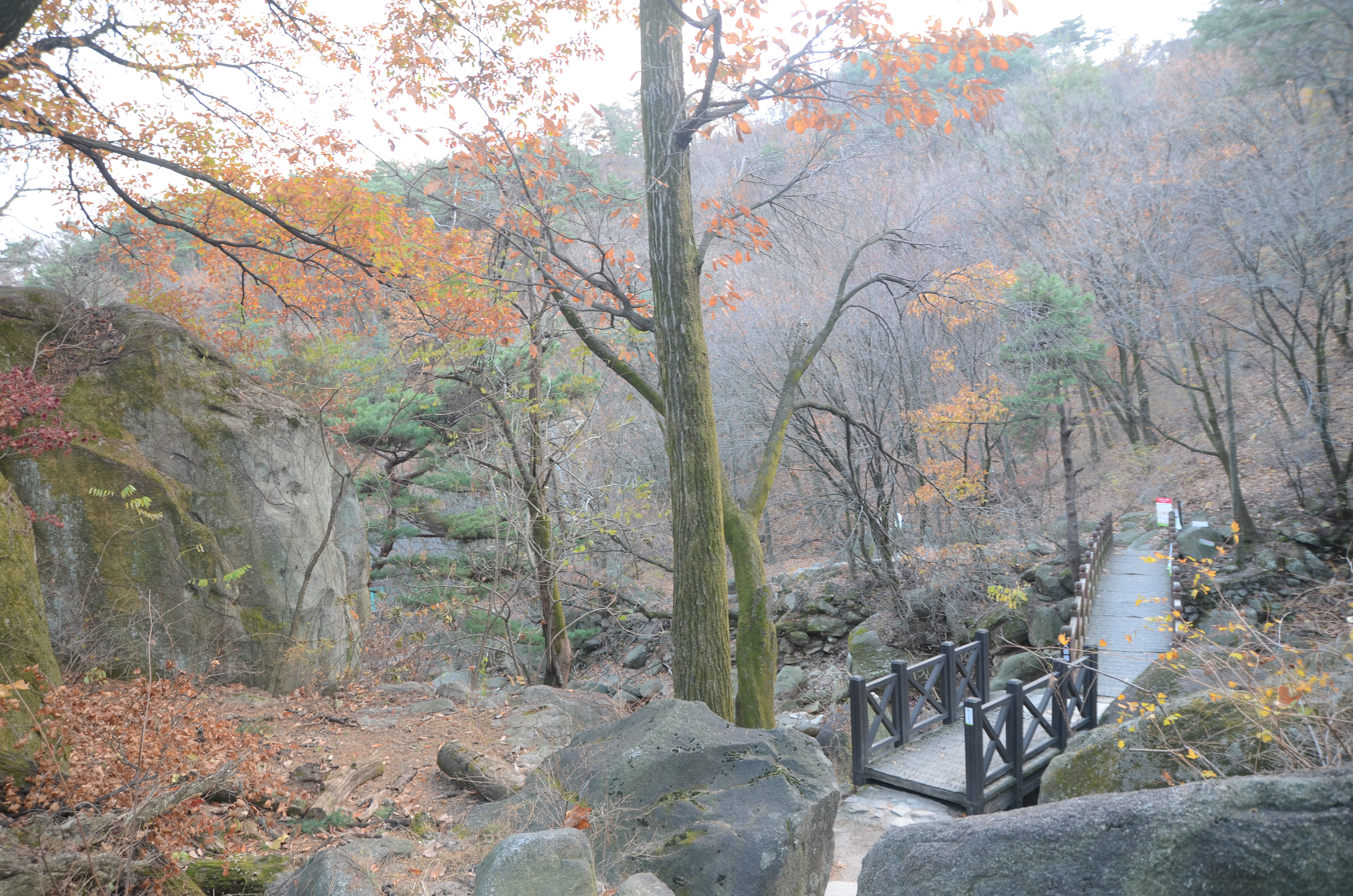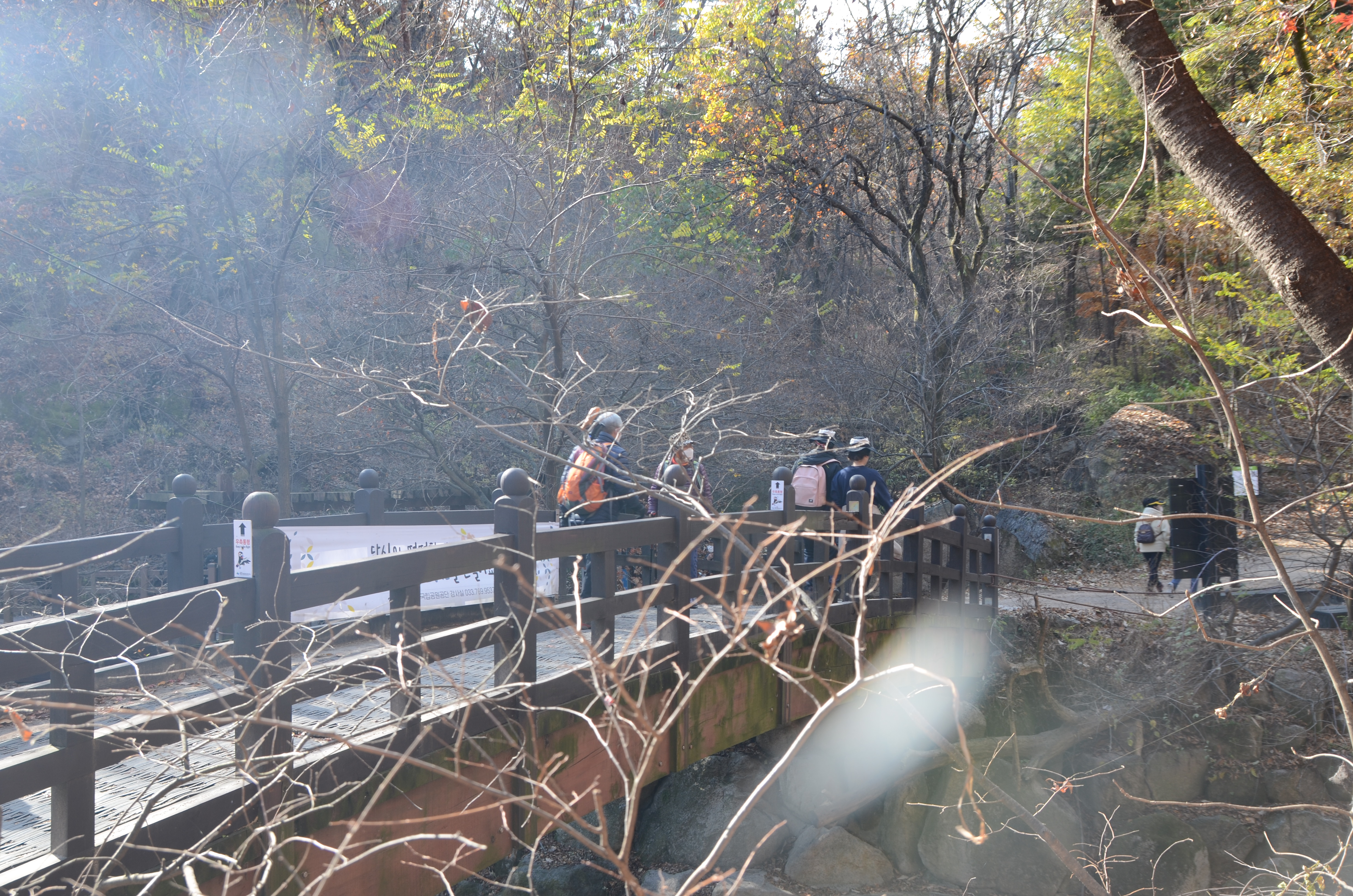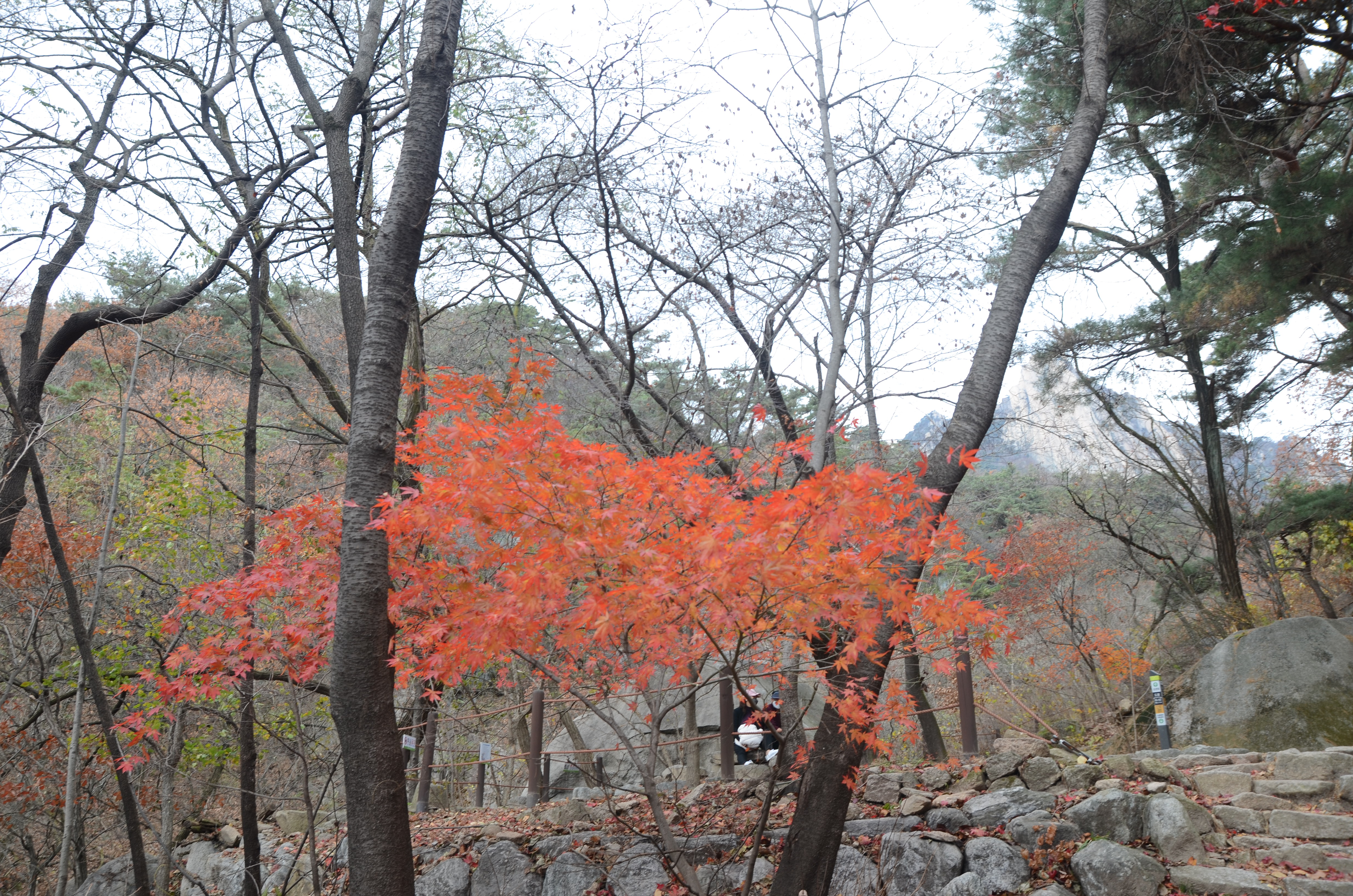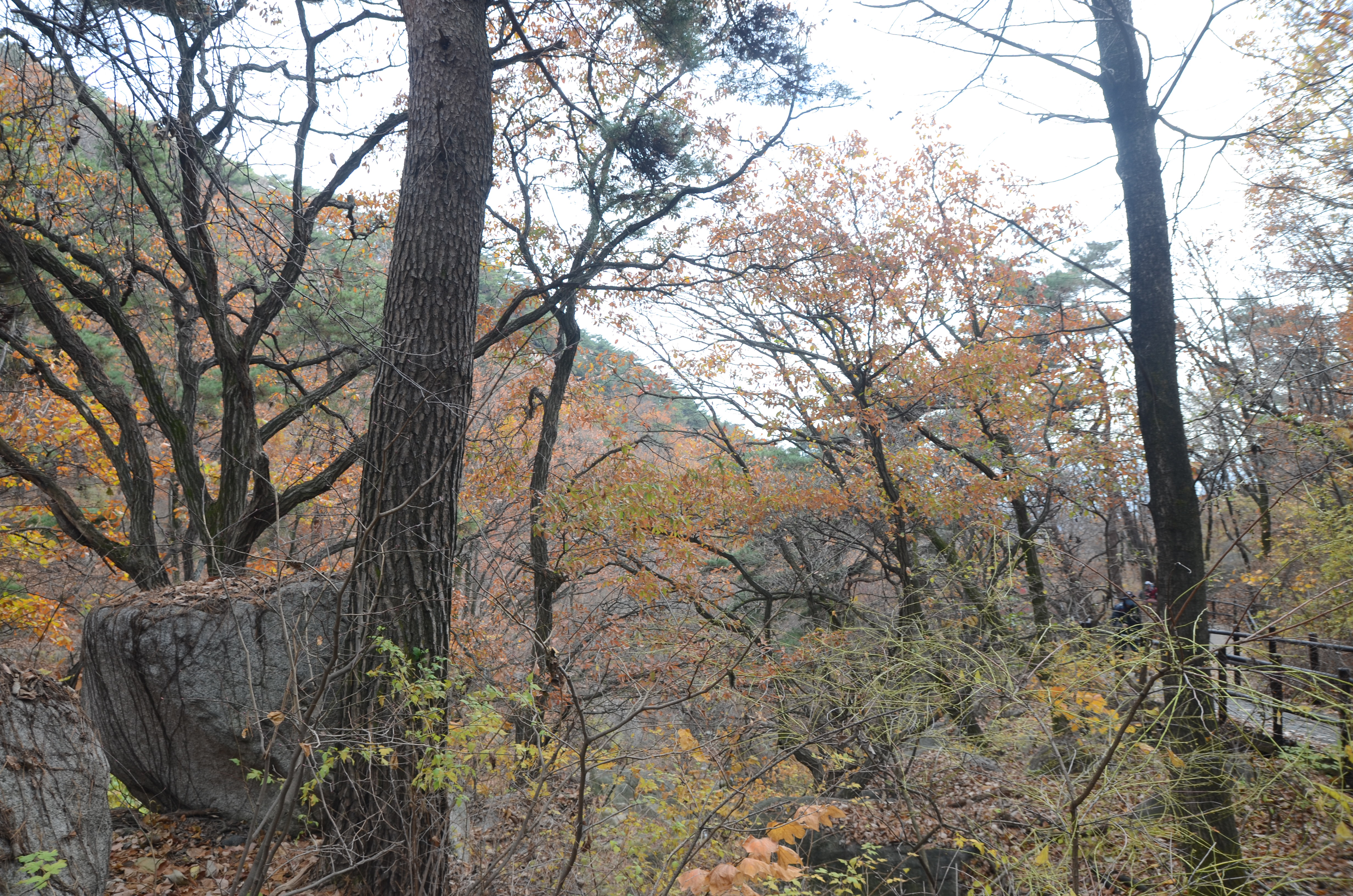 내려 갈 때는 천축사 방향 대신 오른쪽 능선길로 하산하려 하였습니다. 이 길은 흙길로 걷기에 좋습니다. 그런데, 이길로 하산하는 사람이 없었습니다. 마당바위에서 0.4km 정도 하산하니 성도원 이정표가 나옵니다. 원래 능선길은 왼쪽 능선 방향으로 계속 진행해야 하는데 이정표가 없습니다. 시간은 촉박한데, 확실한 길을 선택하기로 합니다. 그래서 성도원 코스를 택해 하산하게 되었습니다. 성도원 입구를 지나 계곡길이 계속되는데 걷기도 좋고 우이암 방향에서 내려오는 산객들도 있어 좋았습니다. 나중 구봉사 절 계곡에서는 짙은 단풍에 감탄하기도 했습니다. 처음의 도봉산탐방지원센터에 도착하니 5:29분이었으며 날이 저물고 있었습니다. 오늘 도봉산 산행 만점이었습니다.
