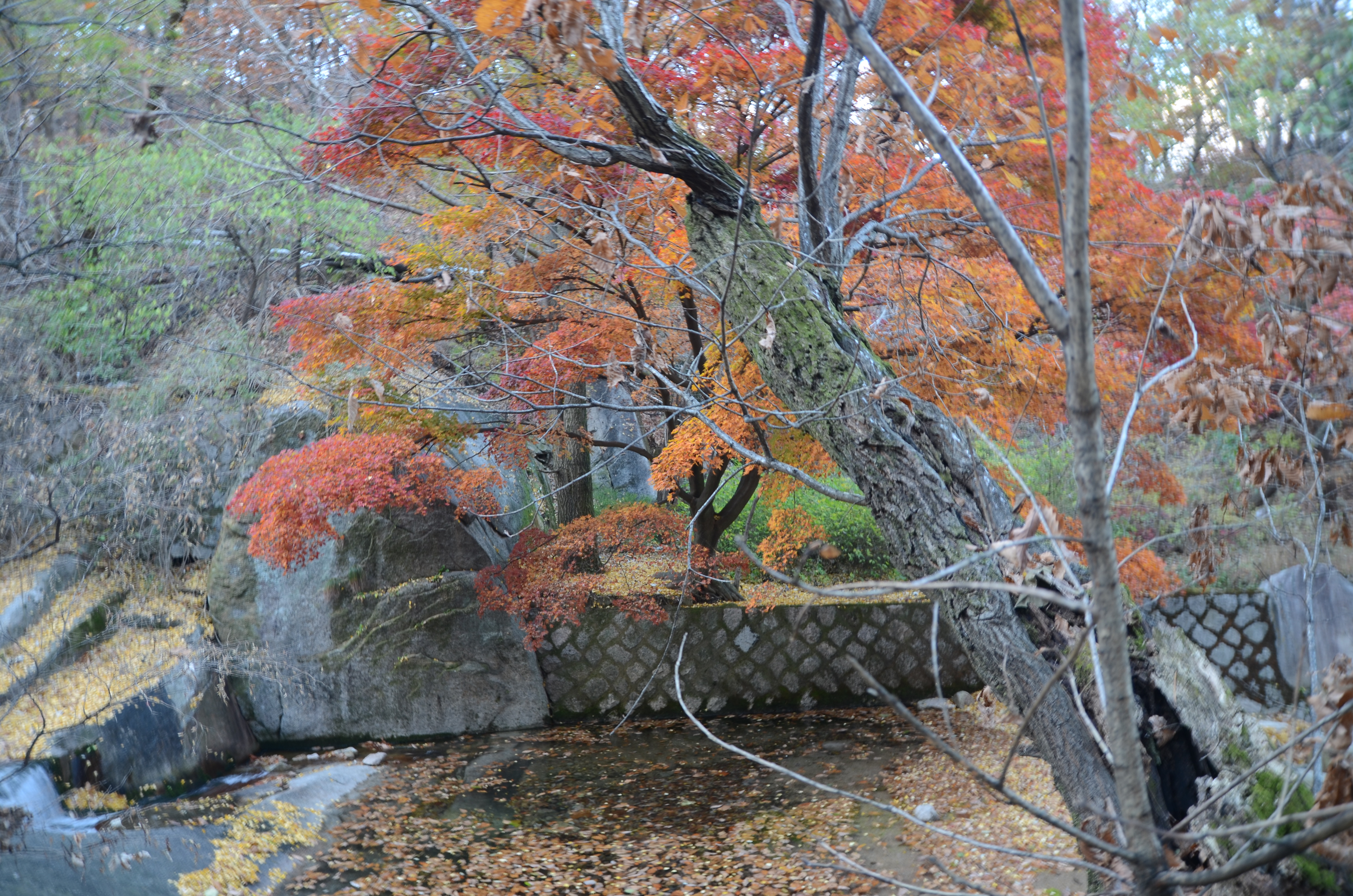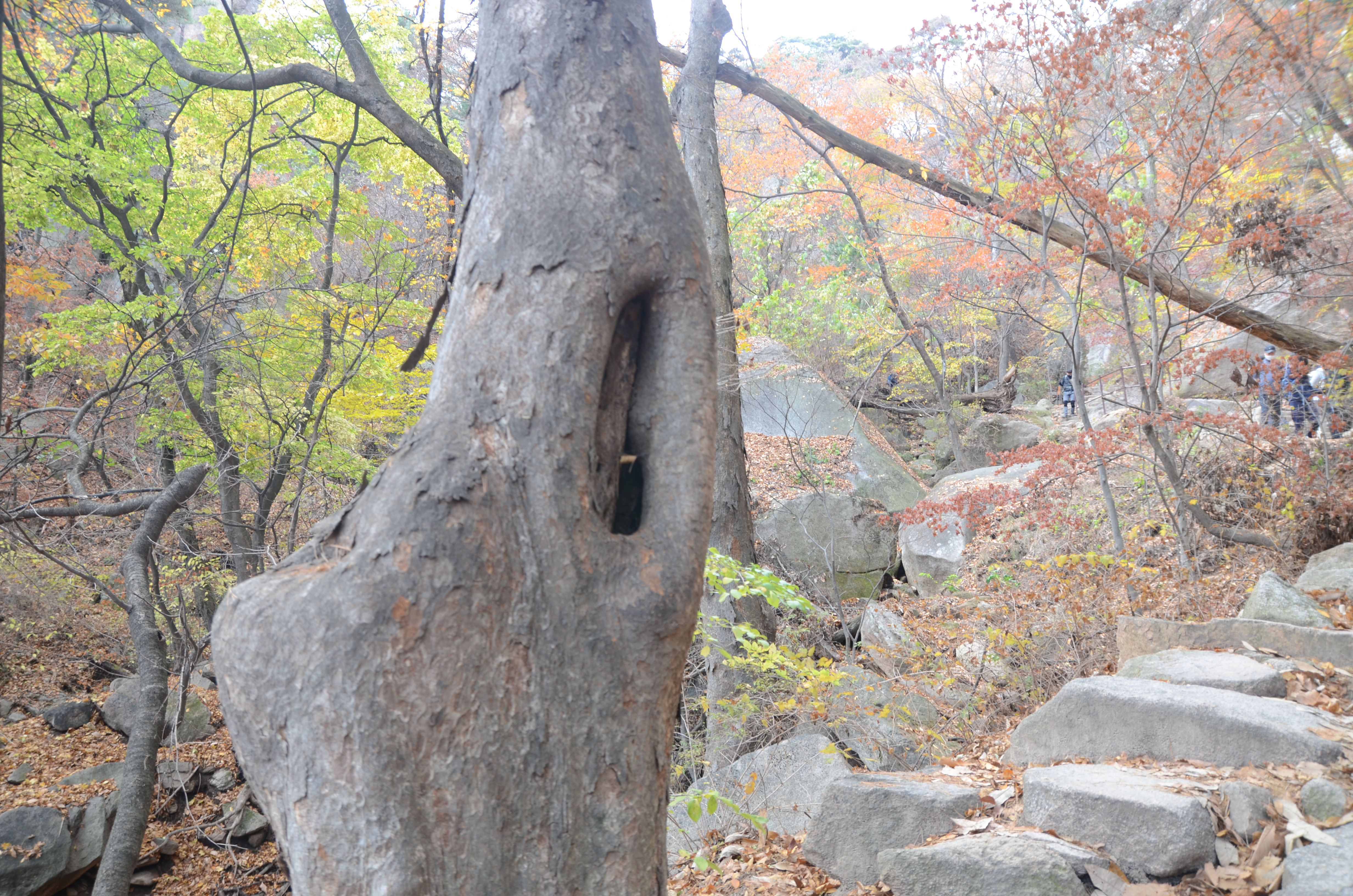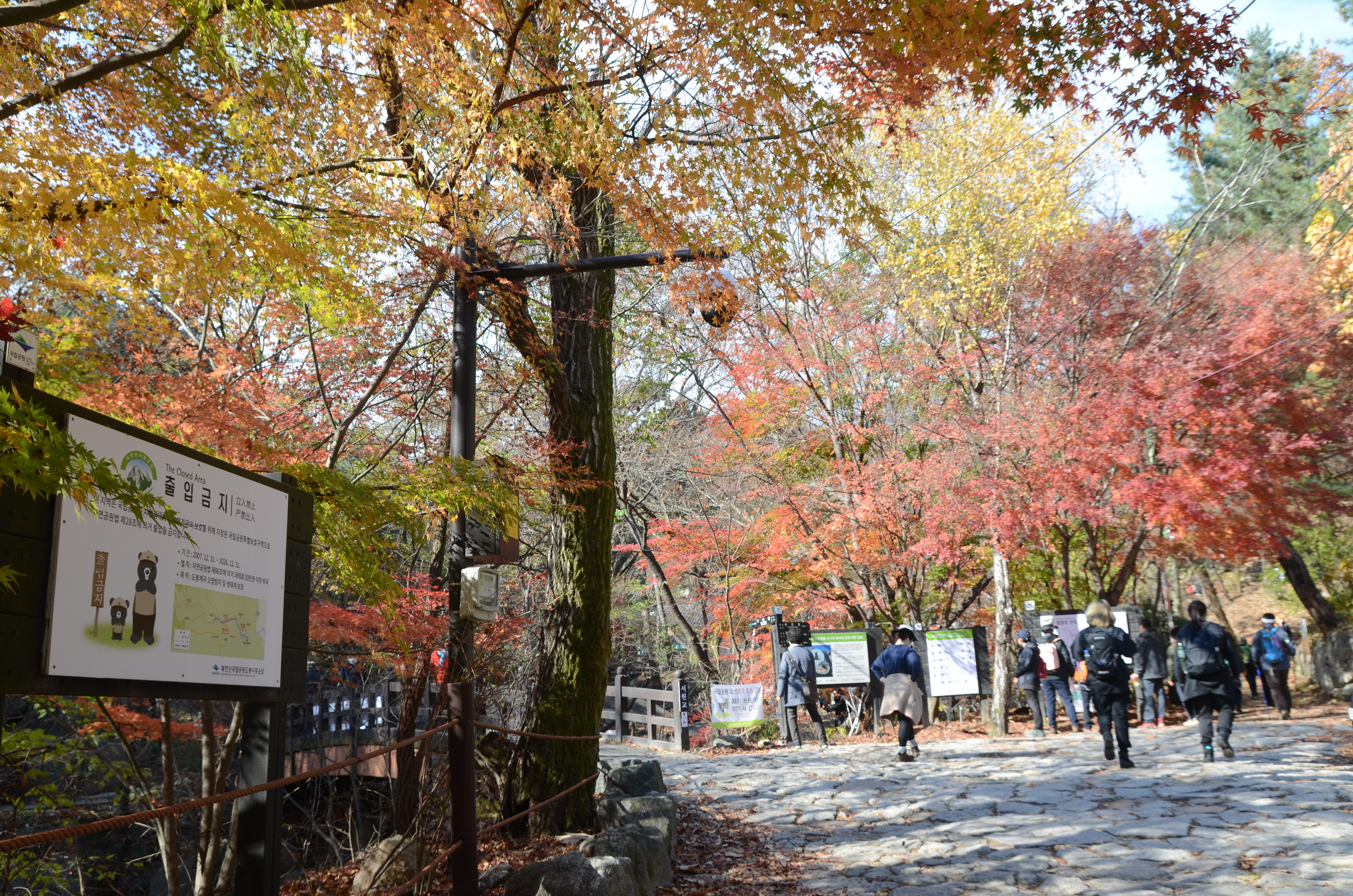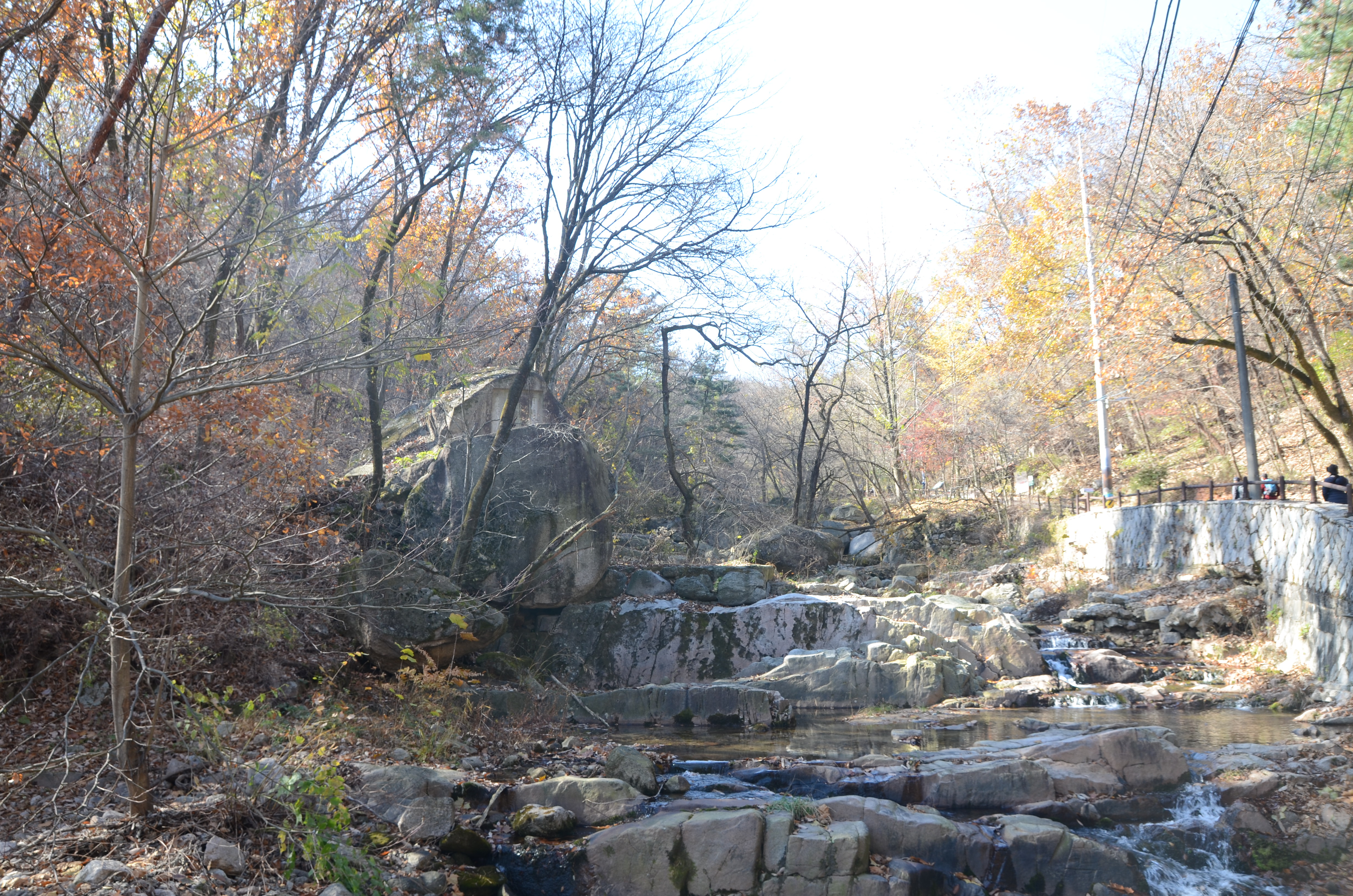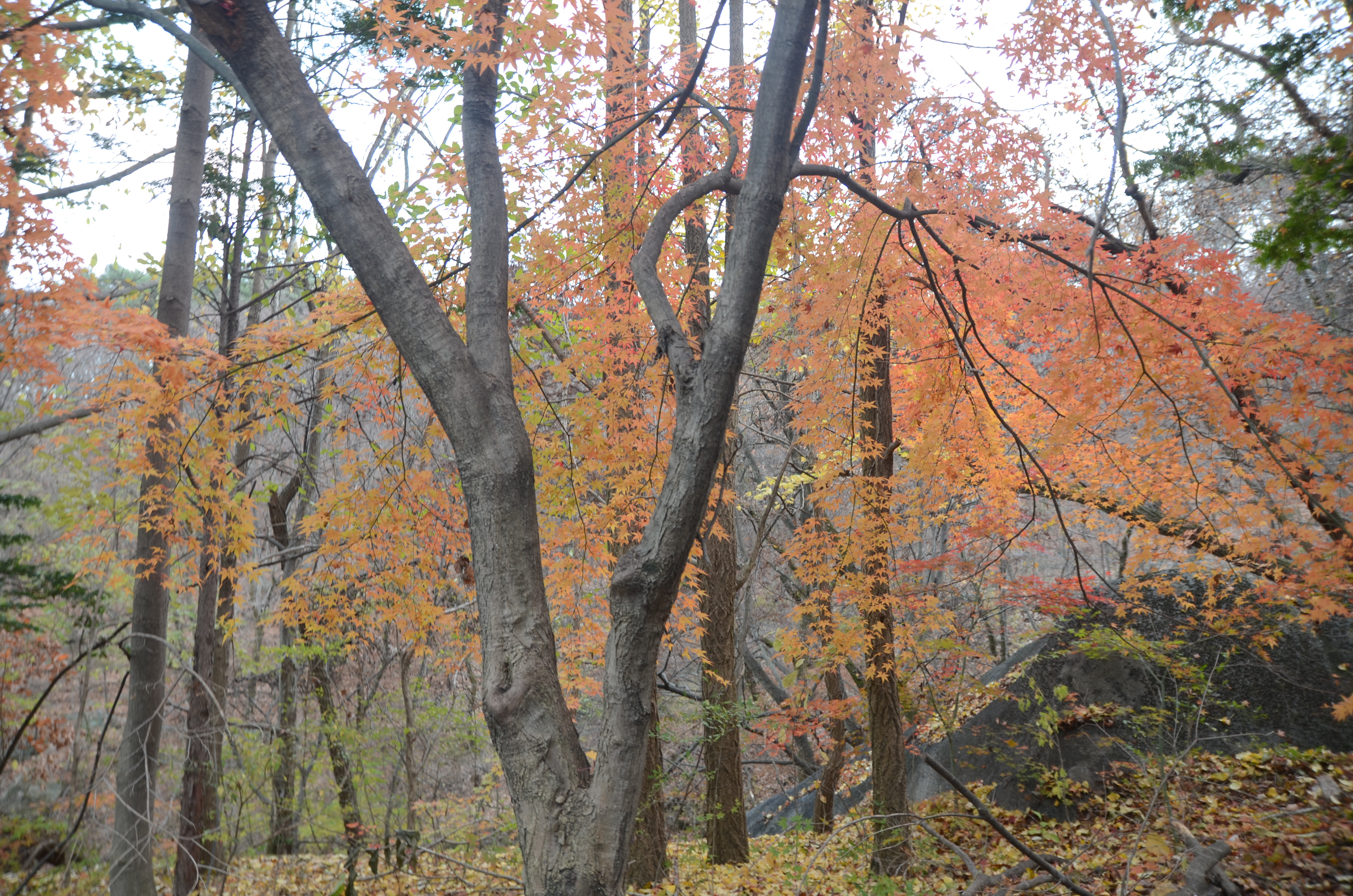 내려 갈 때는 천축사 방향 대신 오른쪽 능선길로 하산하려 하였습니다. 이 길은 흙길로 걷기에 좋습니다. 그런데, 이길로 하산하는 사람이 없었습니다. 마당바위에서 0.4km 정도 하산하니 성도원 이정표가 나옵니다. 원래 능선길은 왼쪽 능선 방향으로 계속 진행해야 하는데 이정표가 없습니다. 시간은 촉박한데, 확실한 길을 선택하기로 합니다. 그래서 성도원 코스를 택해 하산하게 되었습니다. 성도원 입구를 지나 계곡길이 계속되는데 걷기도 좋고 우이암 방향에서 내려오는 산객들도 있어 좋았습니다. 나중 구봉사 절 계곡에서는 짙은 단풍에 감탄하기도 했습니다. 처음의 도봉산탐방지원센터에 도착하니 5:29분이었으며 날이 저물고 있었습니다. 오늘 도봉산 산행 만점이었습니다.