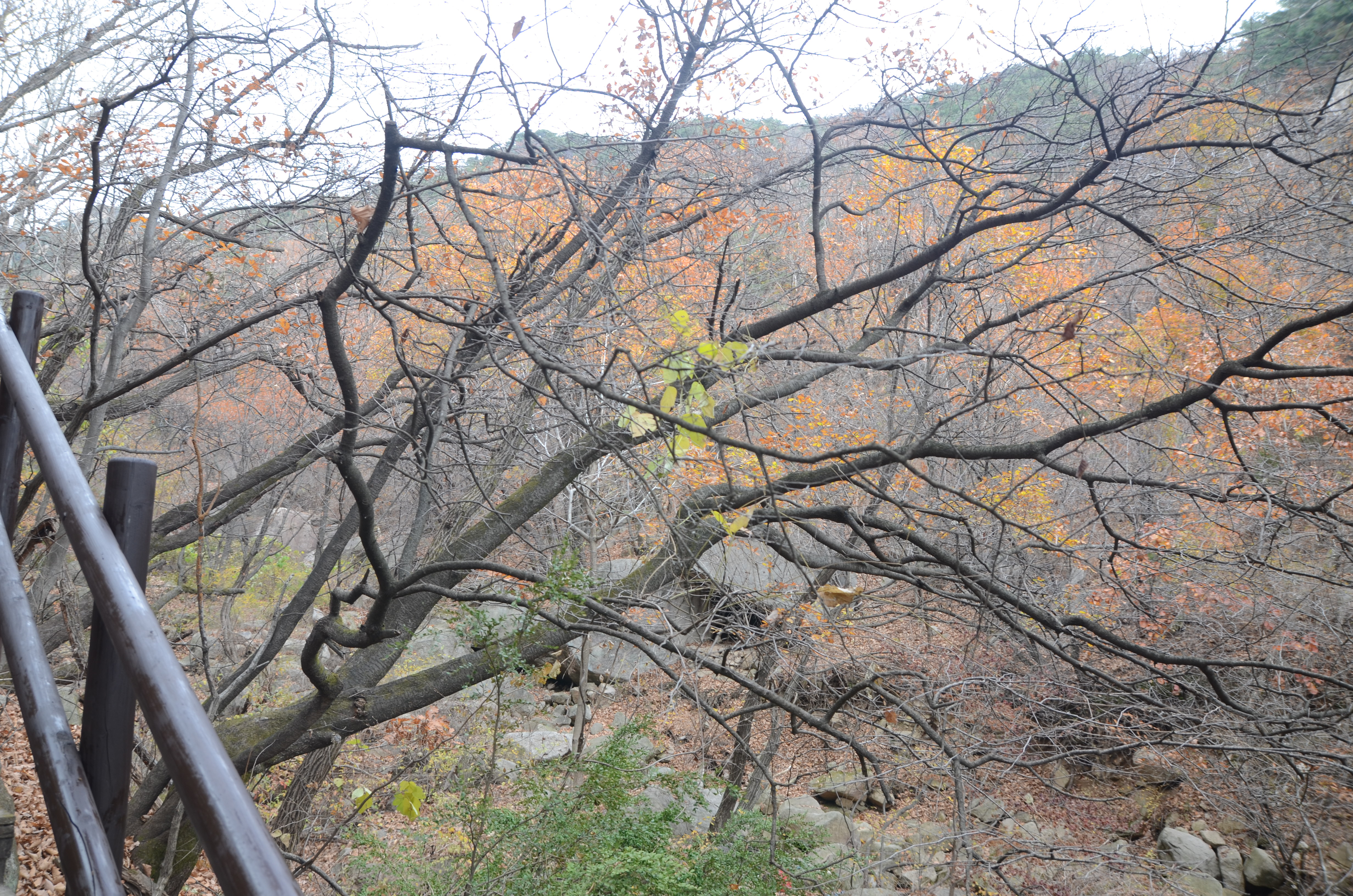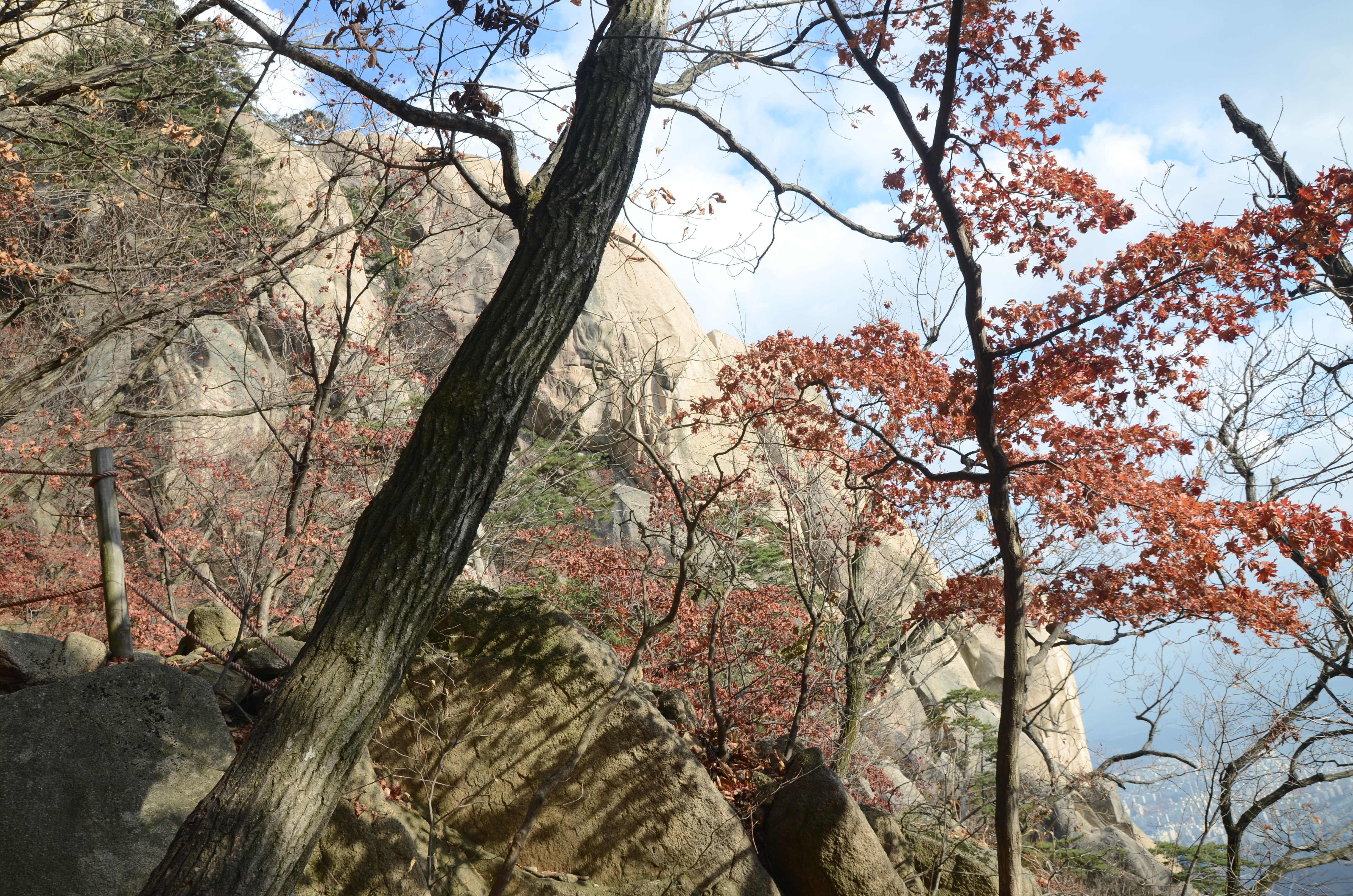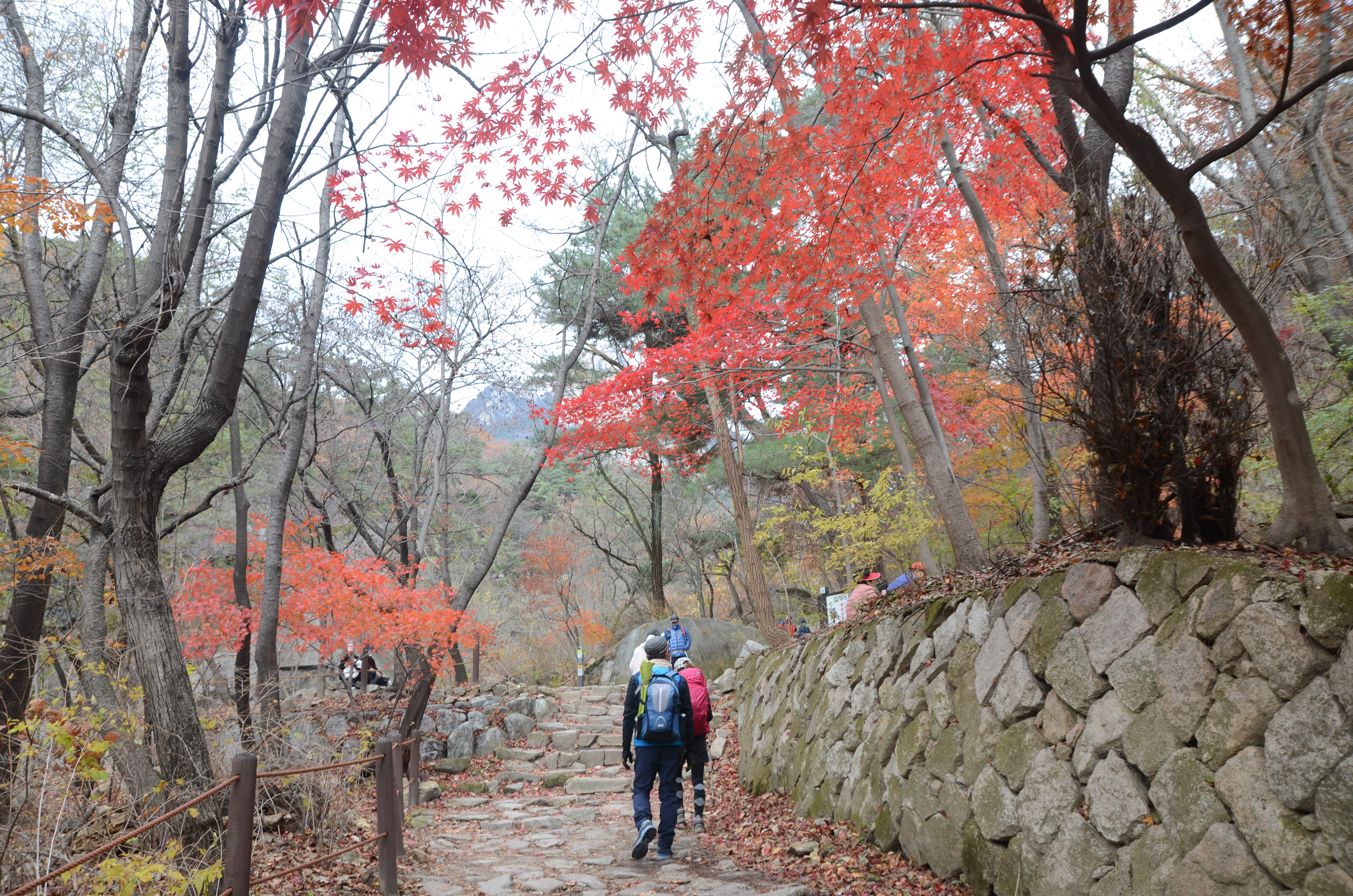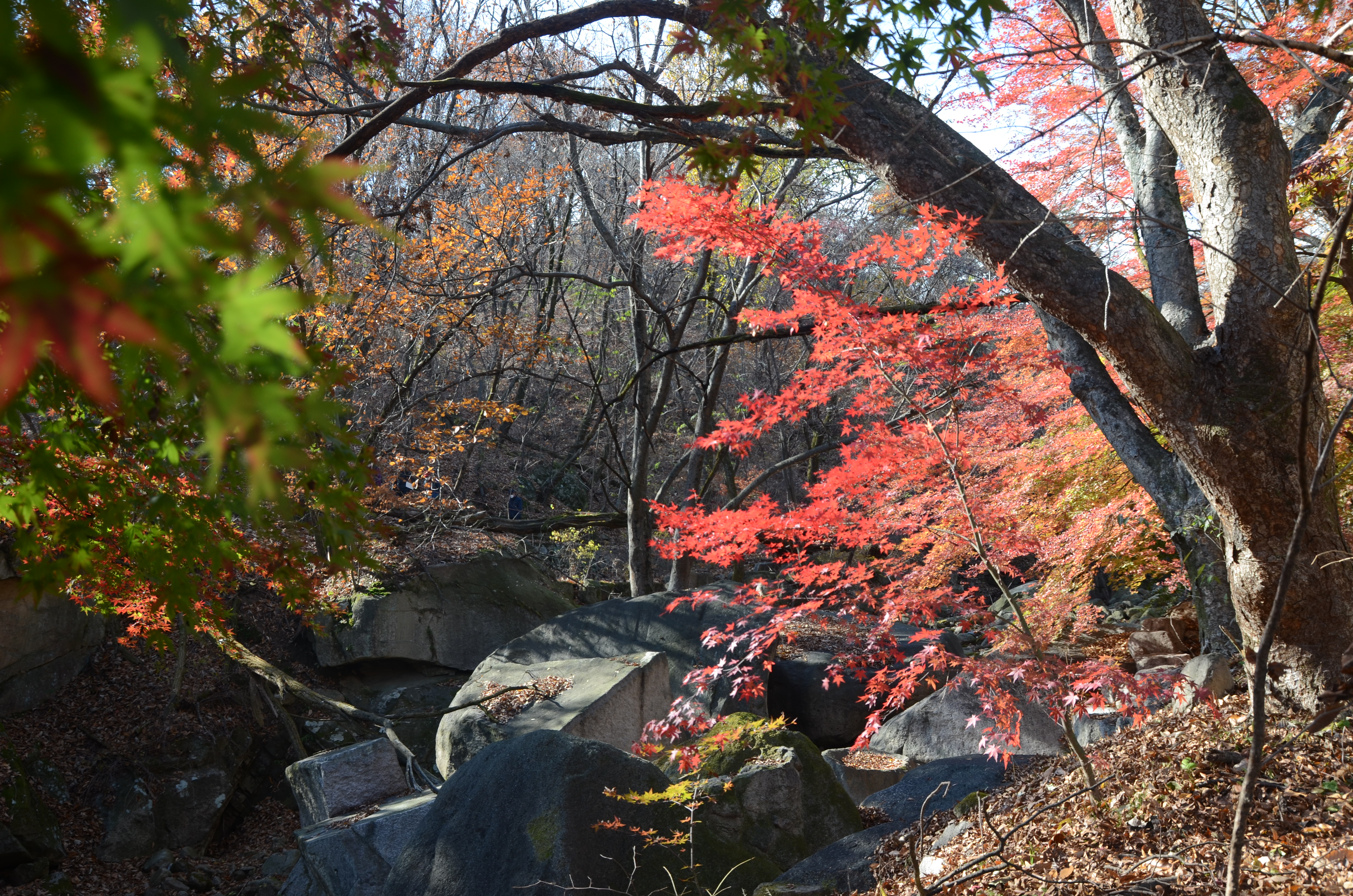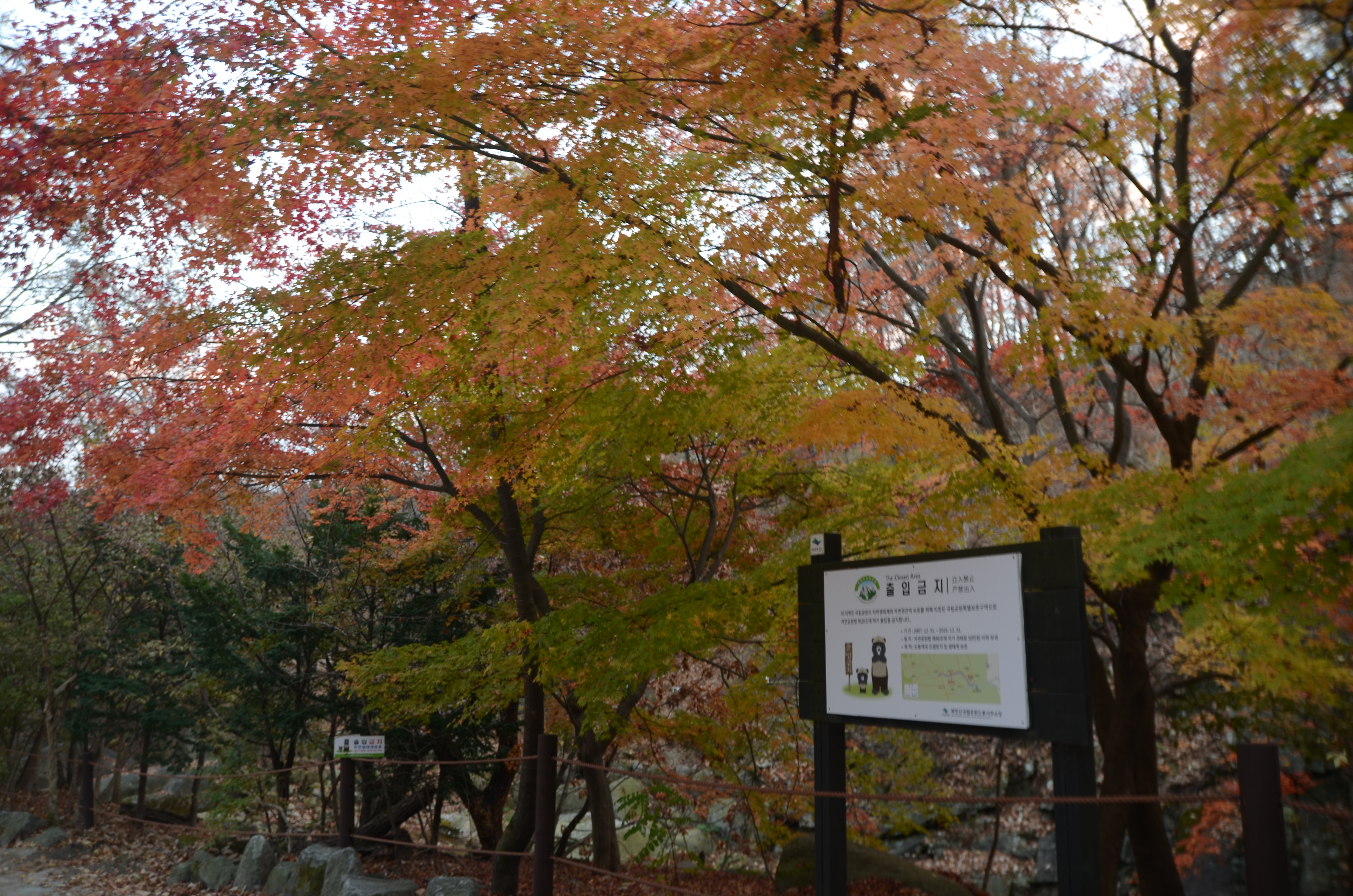 내려 갈 때는 천축사 방향 대신 오른쪽 능선길로 하산하려 하였습니다. 이 길은 흙길로 걷기에 좋습니다. 그런데, 이길로 하산하는 사람이 없었습니다. 마당바위에서 0.4km 정도 하산하니 성도원 이정표가 나옵니다. 원래 능선길은 왼쪽 능선 방향으로 계속 진행해야 하는데 이정표가 없습니다. 시간은 촉박한데, 확실한 길을 선택하기로 합니다. 그래서 성도원 코스를 택해 하산하게 되었습니다. 성도원 입구를 지나 계곡길이 계속되는데 걷기도 좋고 우이암 방향에서 내려오는 산객들도 있어 좋았습니다. 나중 구봉사 절 계곡에서는 짙은 단풍에 감탄하기도 했습니다. 처음의 도봉산탐방지원센터에 도착하니 5:29분이었으며 날이 저물고 있었습니다. 오늘 도봉산 산행 만점이었습니다.