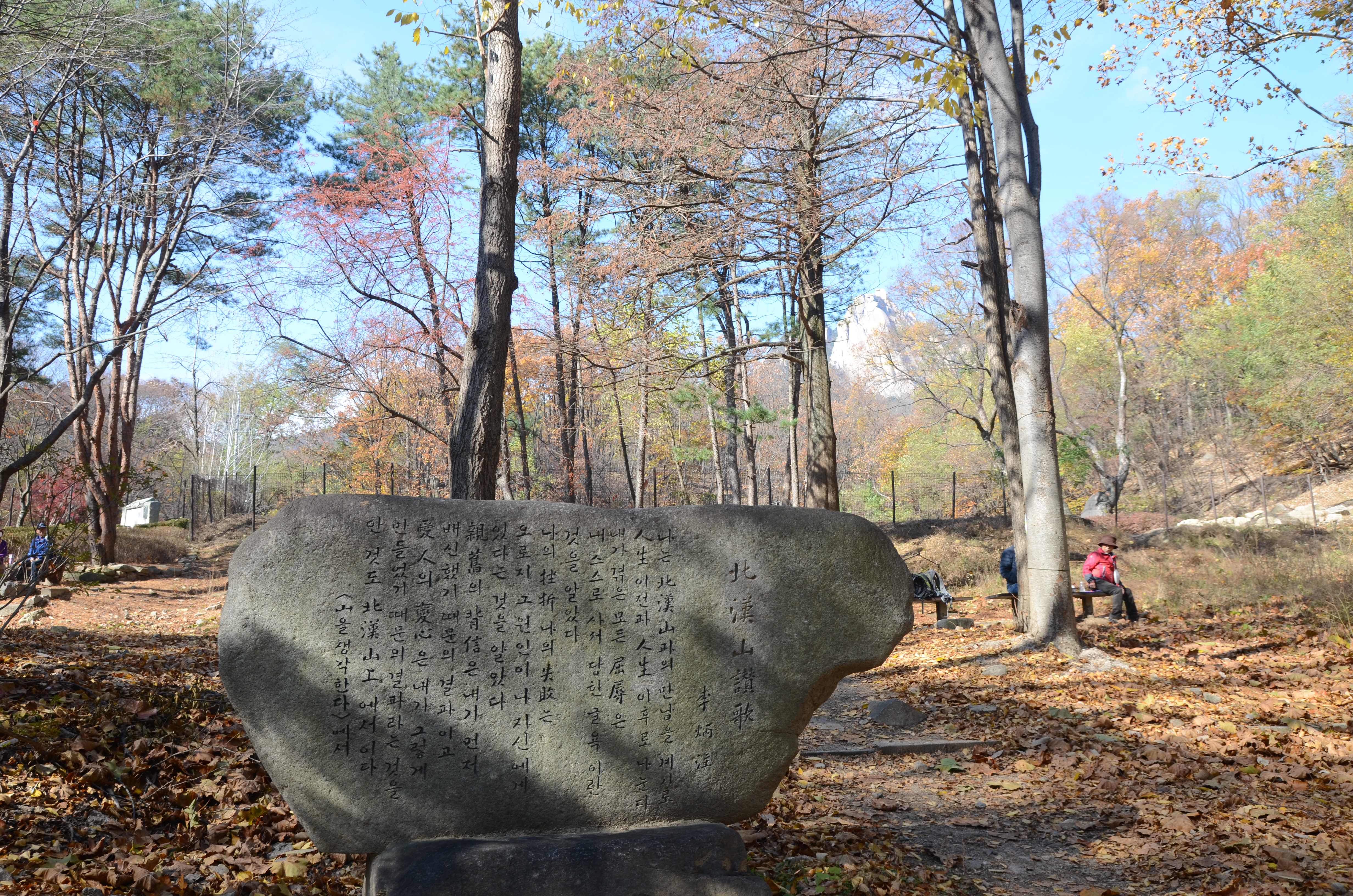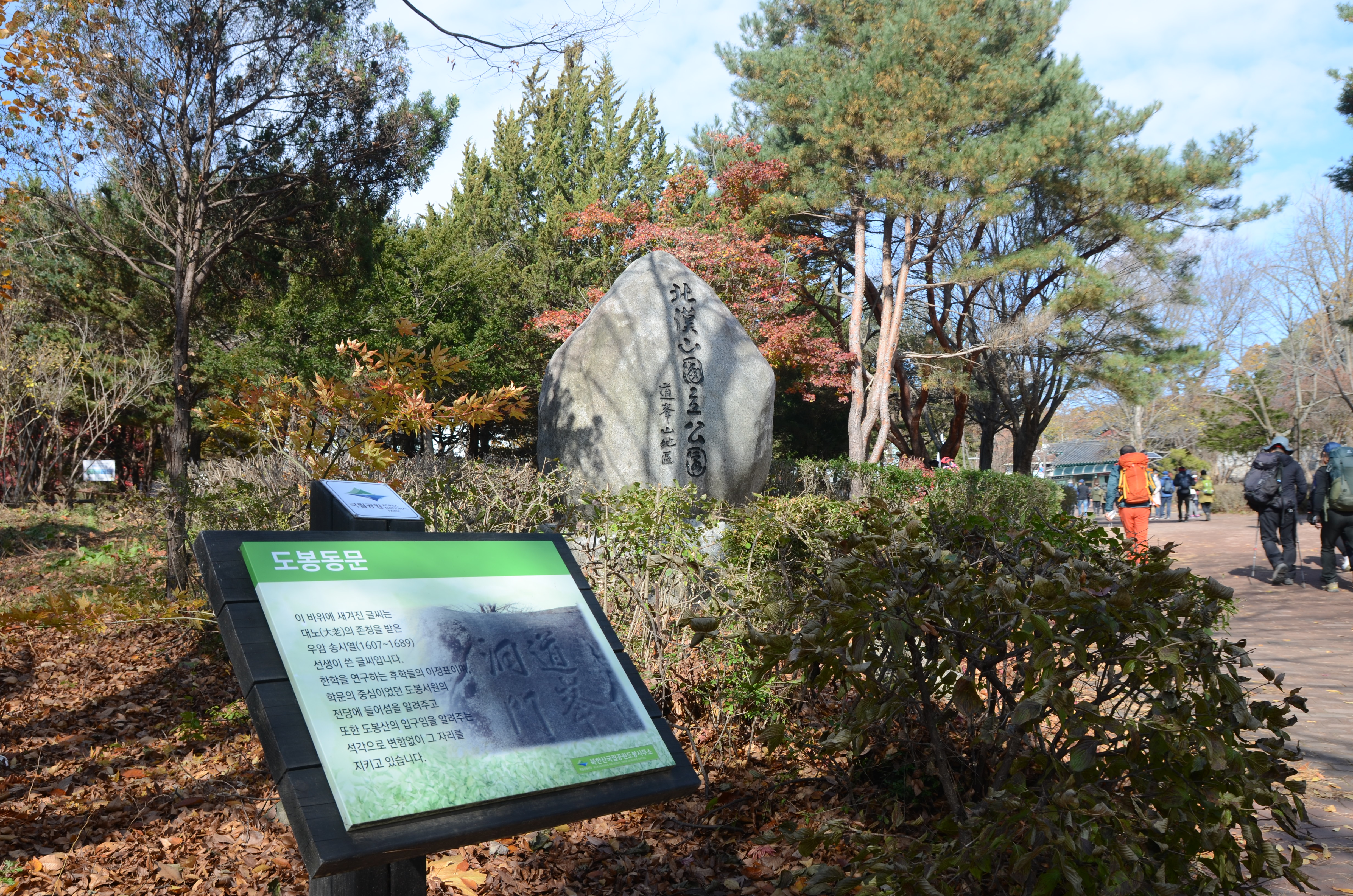 " 이 바위 글씨는 대노(大老)의 존칭을 받은 우암 송시열(1607-1689)의 친필입니다. 한학을 연구하는 후학들의 수학처이며, 학문 토론의 장이었던 도봉서원의 전당에 들어섬을 알리는 동시에 도봉산 초입을 알리는 석각으로 변함없이 그 자리를 지키고 있읍니다. "