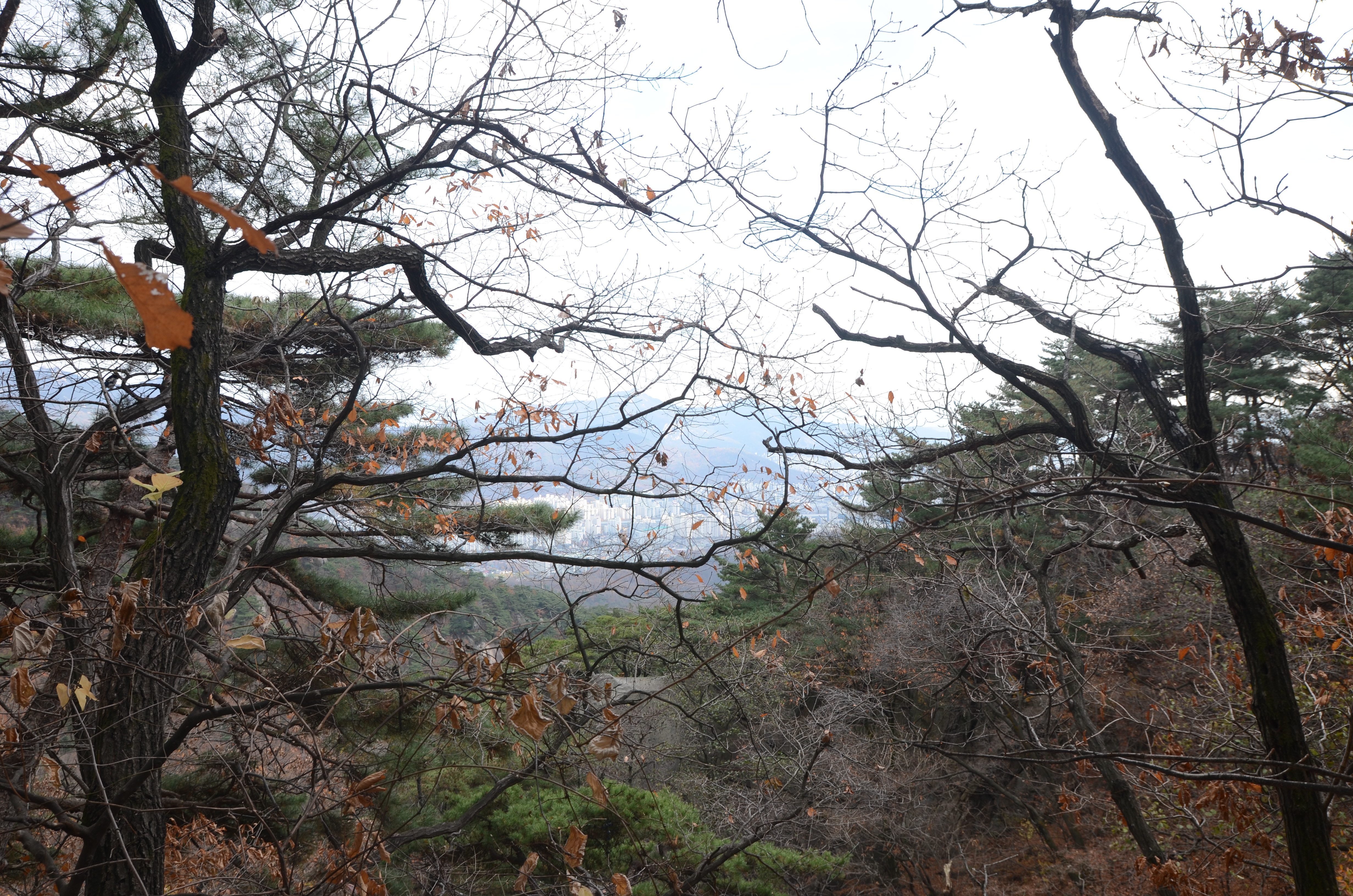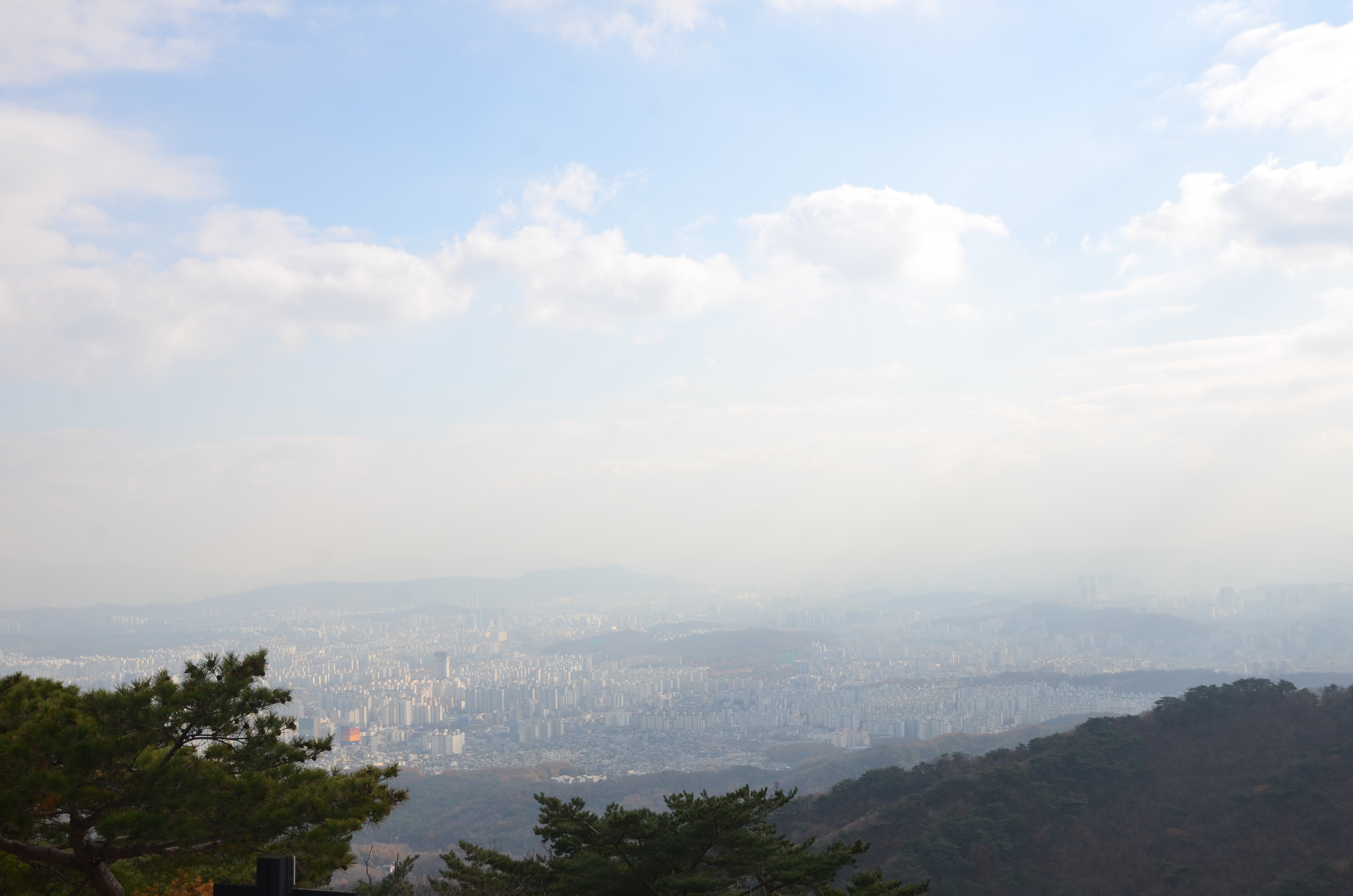 서울 시내 방향, 왼쪽 길게 아차산, 용마산, 망우산 능선.