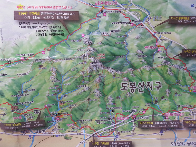 7) 도봉탐방지원센터~능원사~도봉사~보문능선~도봉주능선~우이암~원통사~(무수골 ) 또는 (우이남능선~우이동).