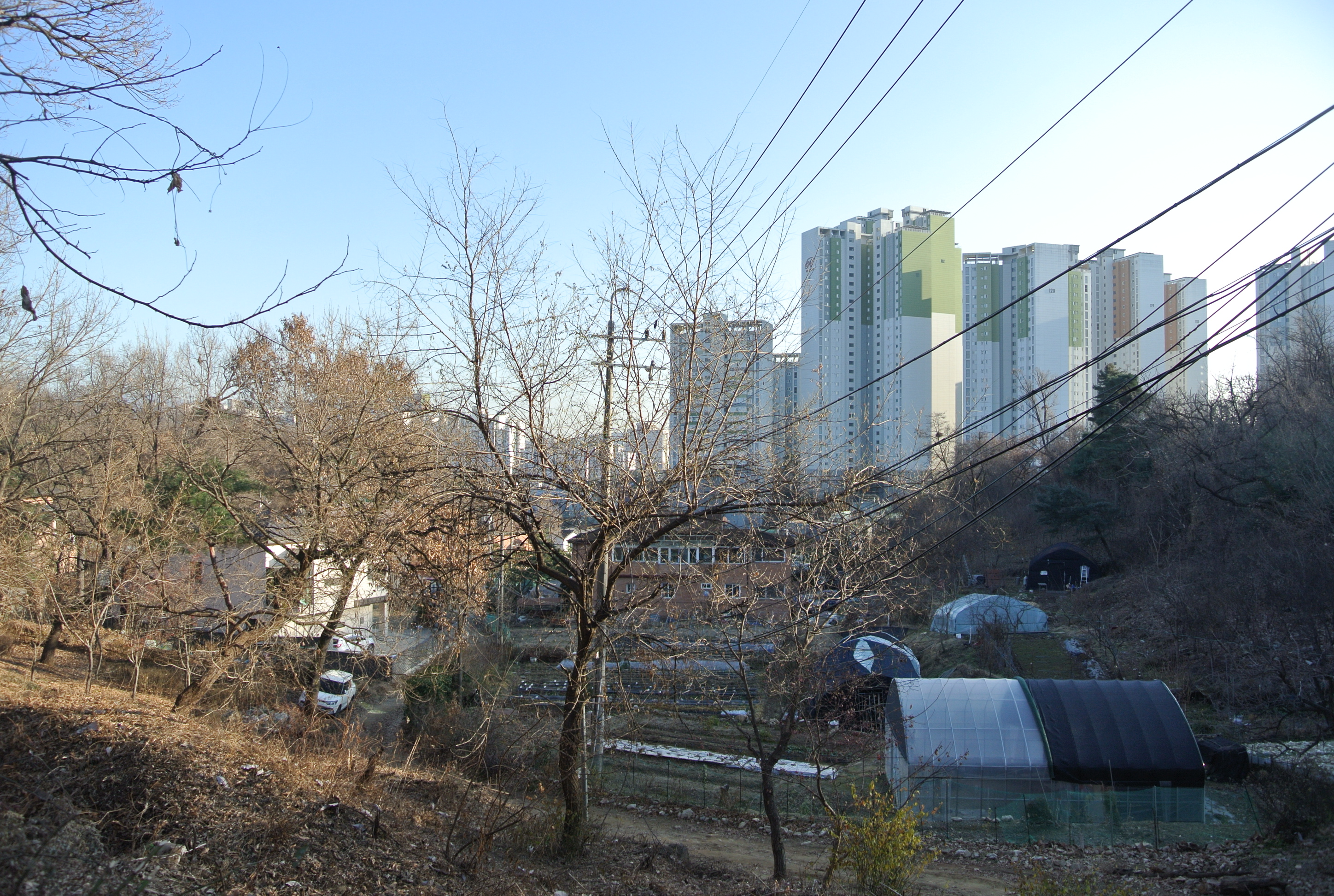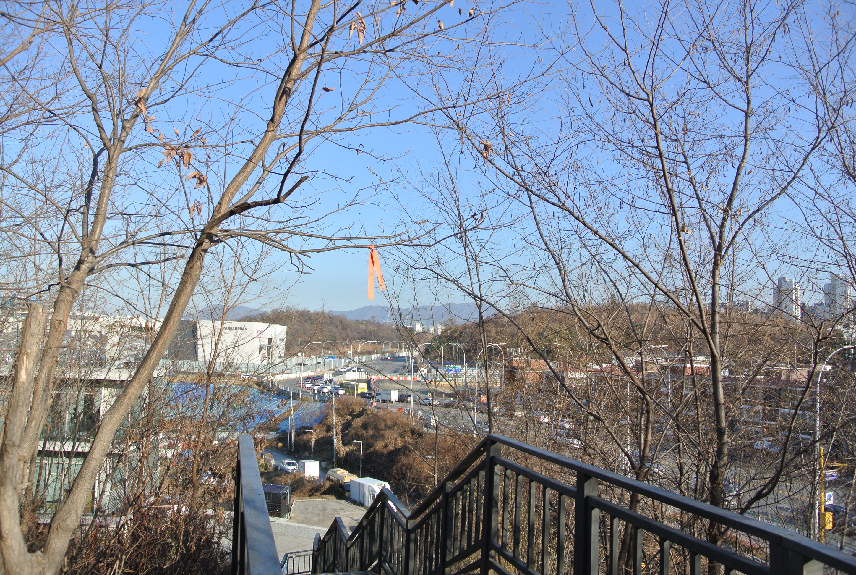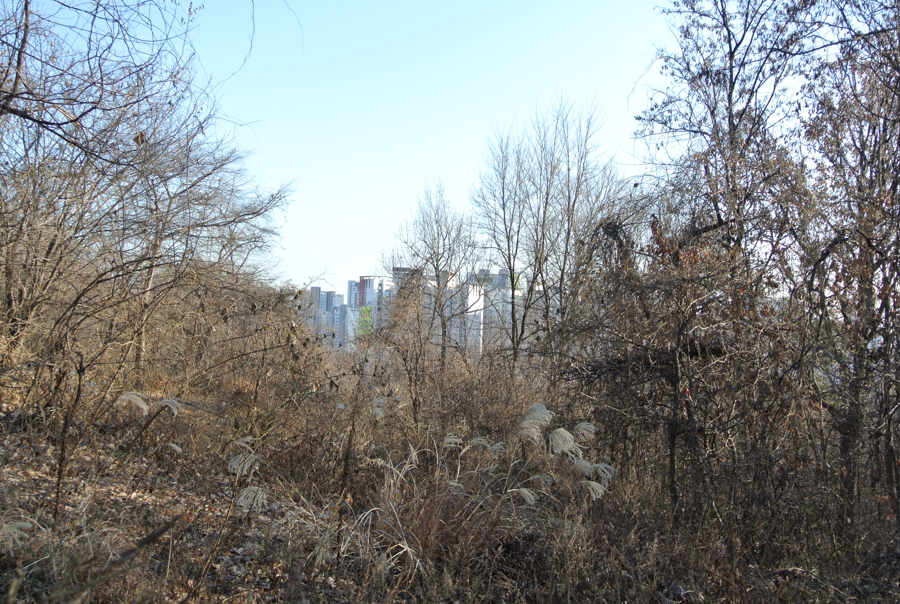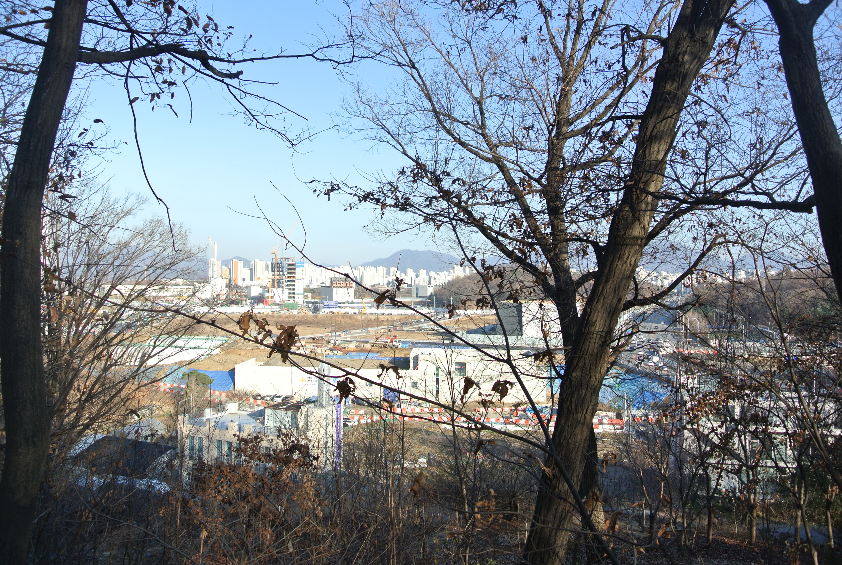 알의 오른쪽 야산은 방죽근린공원, 왼쪽은 고덕천 곁의 강일동 야산.