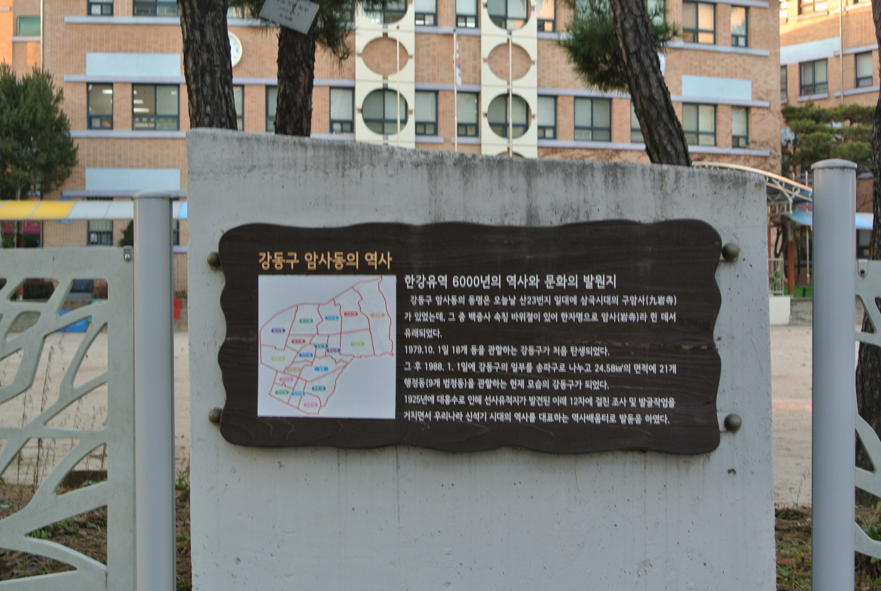 강동구 암사동의 동명은 오늘날 산 23번지 일대에 삼국시대의 구암사(九岩寺)가 있었는데, 그 중 백중사 속칭 바위절이 있어 한자명으로 암사(岩寺)라 한데서 유래되었다. 1979.10.1일 18개 동을 관할하는 강동구가 처음 탄생하였다. 그 후 1988.1.1일에 강동구의 일부를 송파구로 나누고 24.58M2의 면적에 21개 행정동(9개 법정동)을 관할하는 현재 모습의 강동구가 되었다. 1925년 대홍수로 인해 선사유적지가 발견된 이래 12차에 걸친 조사 및 발굴작업을 거치면서 우리나라 신석기 시대의 역사를 대표하는 역사배움터로 발돋움 하였다.