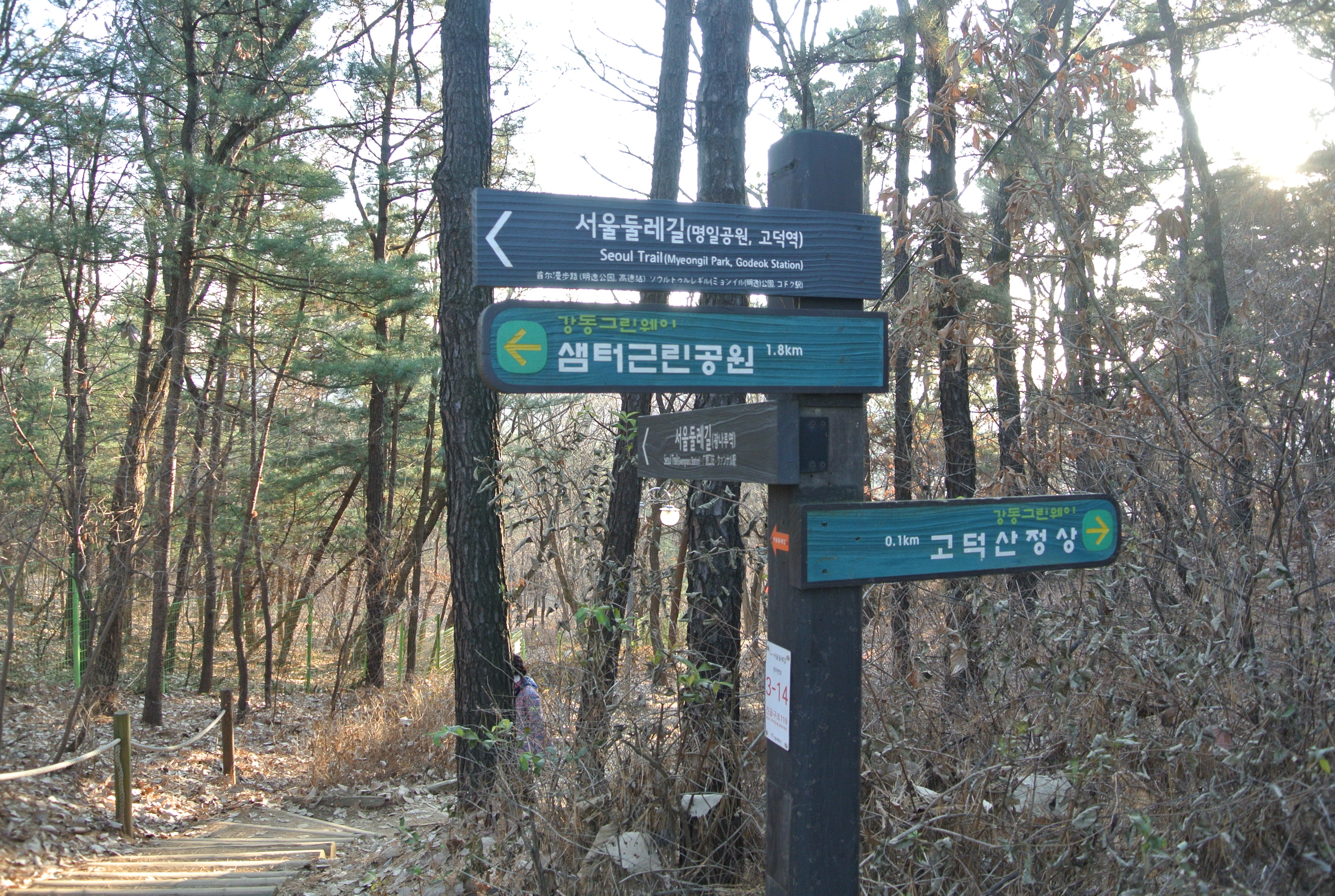 < 서울둘레길(명일공원, 고덕역), <- 1.3KM 고덕그린웨이 샘터근린공원, -> 고덕산정상 0.1KM