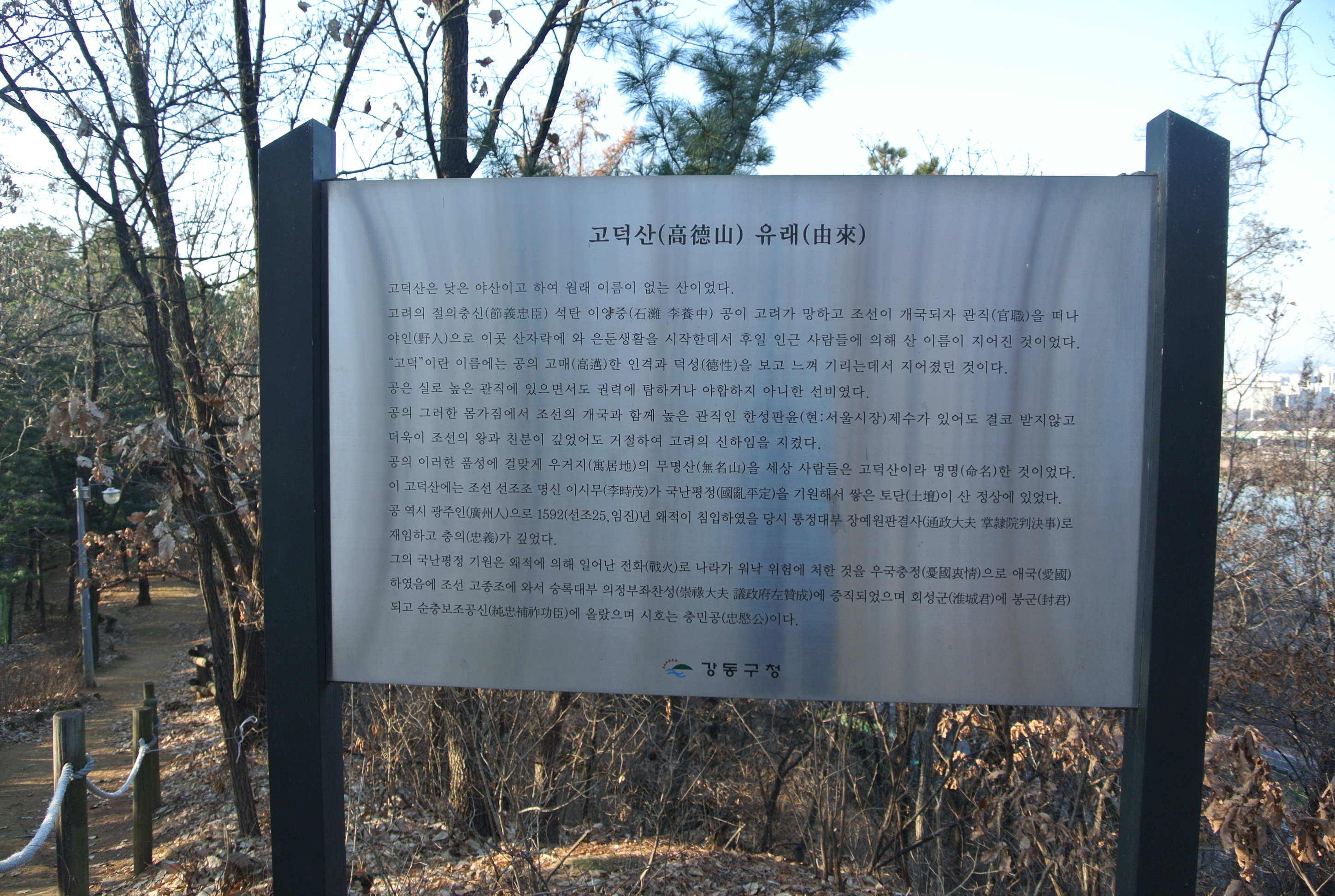 고덕산은 낮은 야산이고 하여 원래 이름이 없는 산이었다. 고려의 절의충신 석탄 이양중(石灘 李養中) 공이 고려가 망하고 조선이 개국되자 관직을 떠나 야인으로 이곳 산자락에 운둔생활을 시작한데서 후일 인근 사람들에 의해 산 이름이 지어진 것이었다. "고덕"이란 이름에는 공의 고매(高邁)한 인격과 덕성(德性)을 보고 느껴 기리는 데서 지어졌던 것이다. 공은 실로 높은 관직에 있으면서도 권력에 탐하거나 야합화지 아니한 섭비였다. 공의 그러한 몸가짐에서 조선의 개국과 함께 높은 관직인 한성판윤(현; 서울시장)제수가 있어도 결코 받지아니하고 더욱이 조선의 왕과 친분이 깊어도 거절하여 고려의 신하임을 지켰다. 공의 이러한 품성에 걸맞게 우거지(寓居地)의 무명산(無名山)을 세상 사람들이 고덕산이라 명명한 것이었다. 이 고덕산에는 조선 선조조 명신 이시무(李時茂)가 국난 평정을 기원해 서 쌓은 토단(土檀)이 이 산 정상에 있었다. 공 역시 광주인(廣州人)으로 1592년(선조25, 임진)년 왜적이 침입하였을 당시 통정대부 장예원판결사로 재임하고 충의가 깊었다. 그이 국난평정 기원은 왜적에 의해 일어난 전화로 나라가 워낙 위험에 처한 것을 우국충정으로 애국하였음에 조선 고종조에 와서 승록대부 의정부좌찬성에 증직되었으며 회성군에 봉군되고 순충보조공신에 올랐으며 시호는 충민공이다. - 강동구청