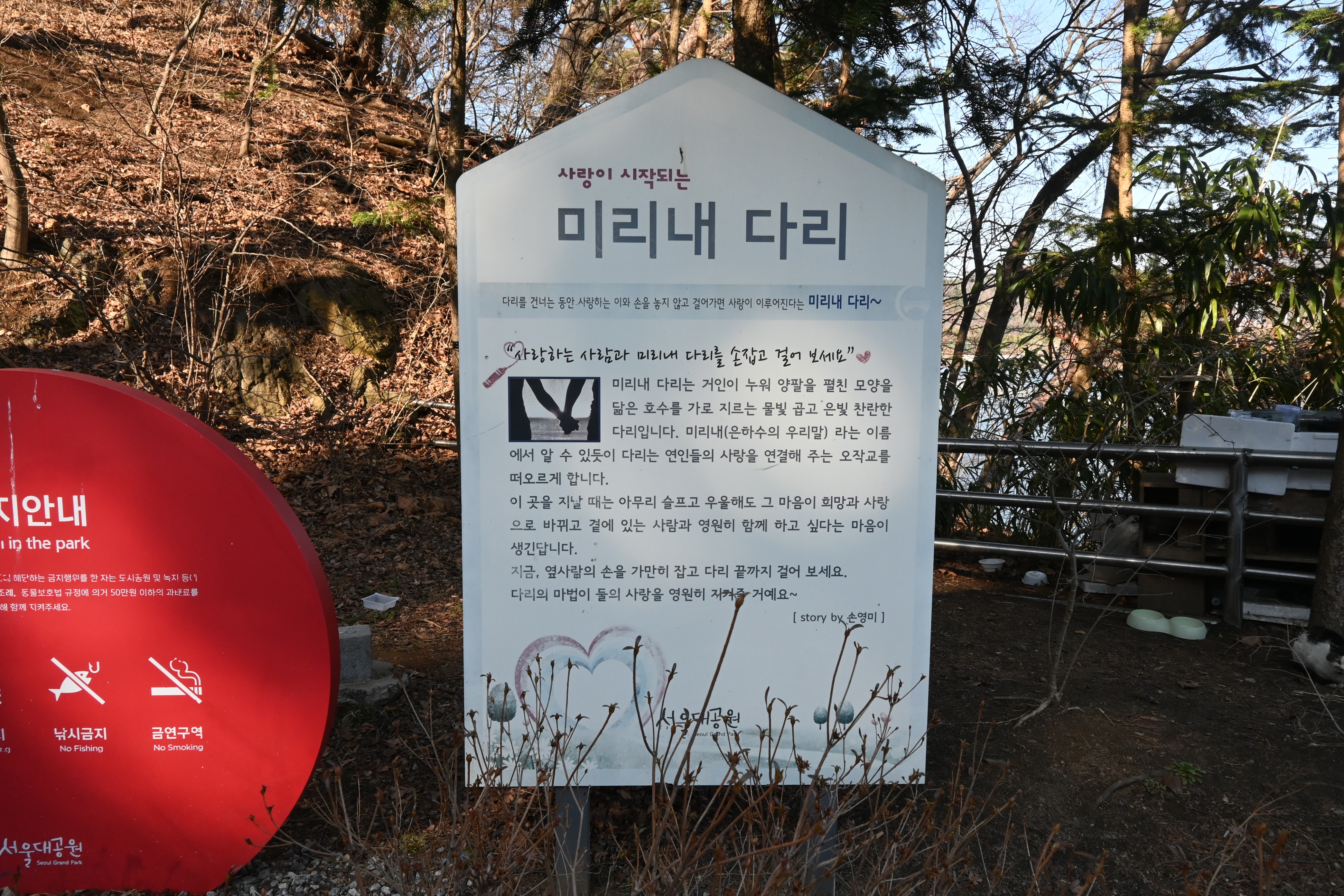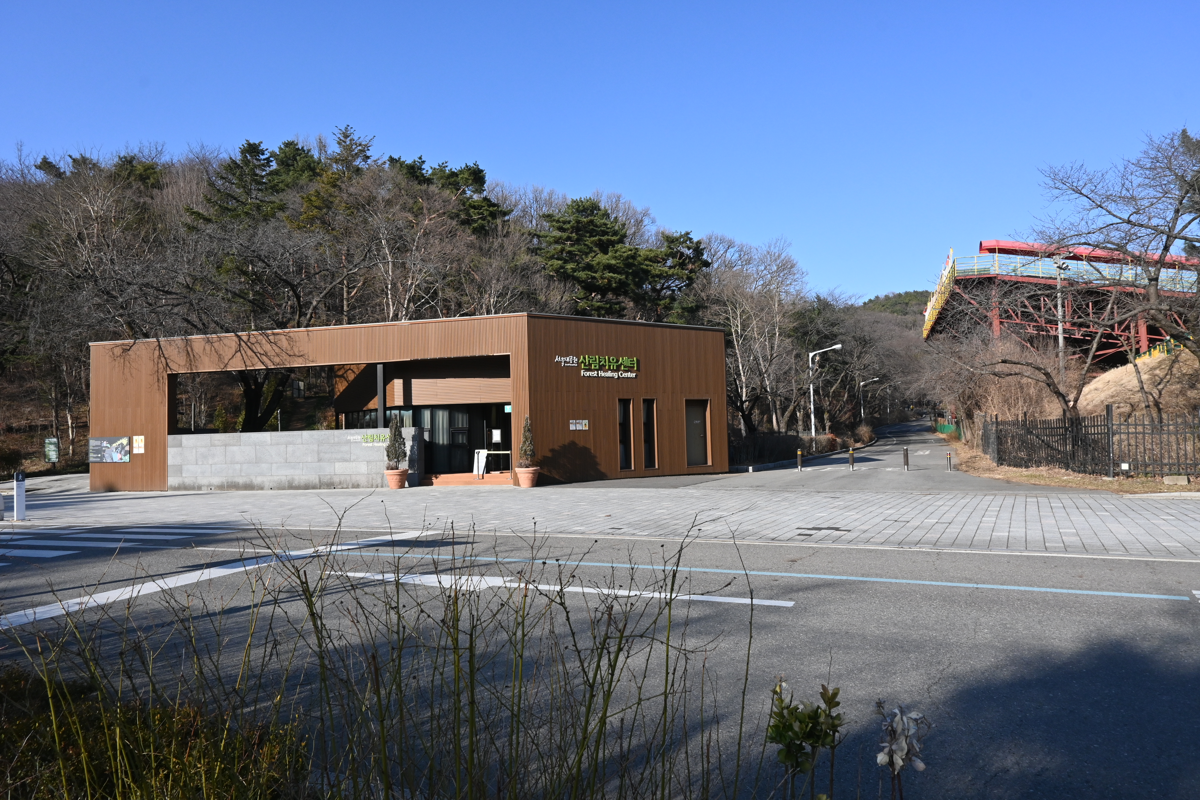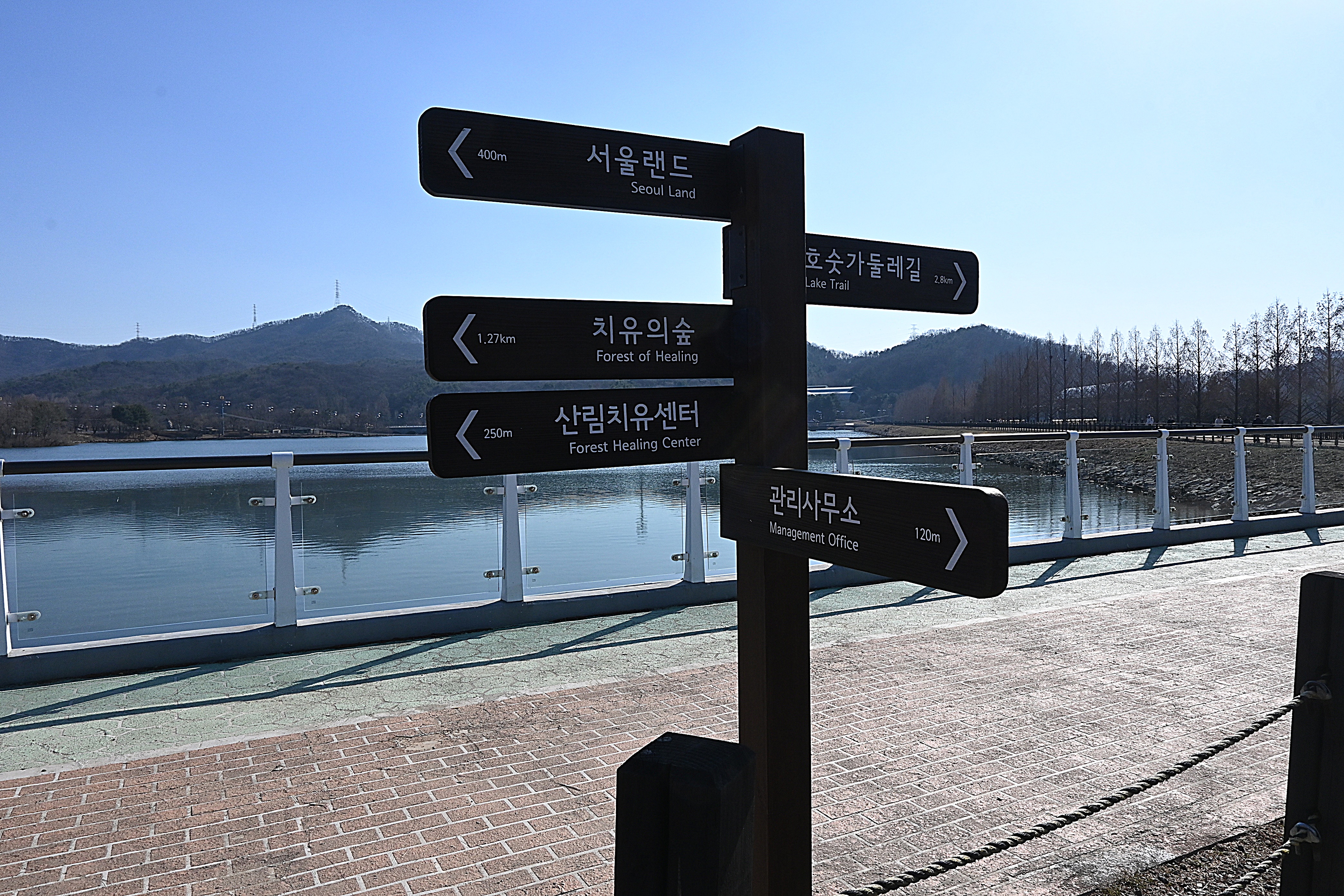 <- 400m 서울랜드, <- 1.27km 치유의 숲, <- 250m 산림치유센터, -> 2.8km 호숫가 둘레길, ↓ 관리사무소 120m