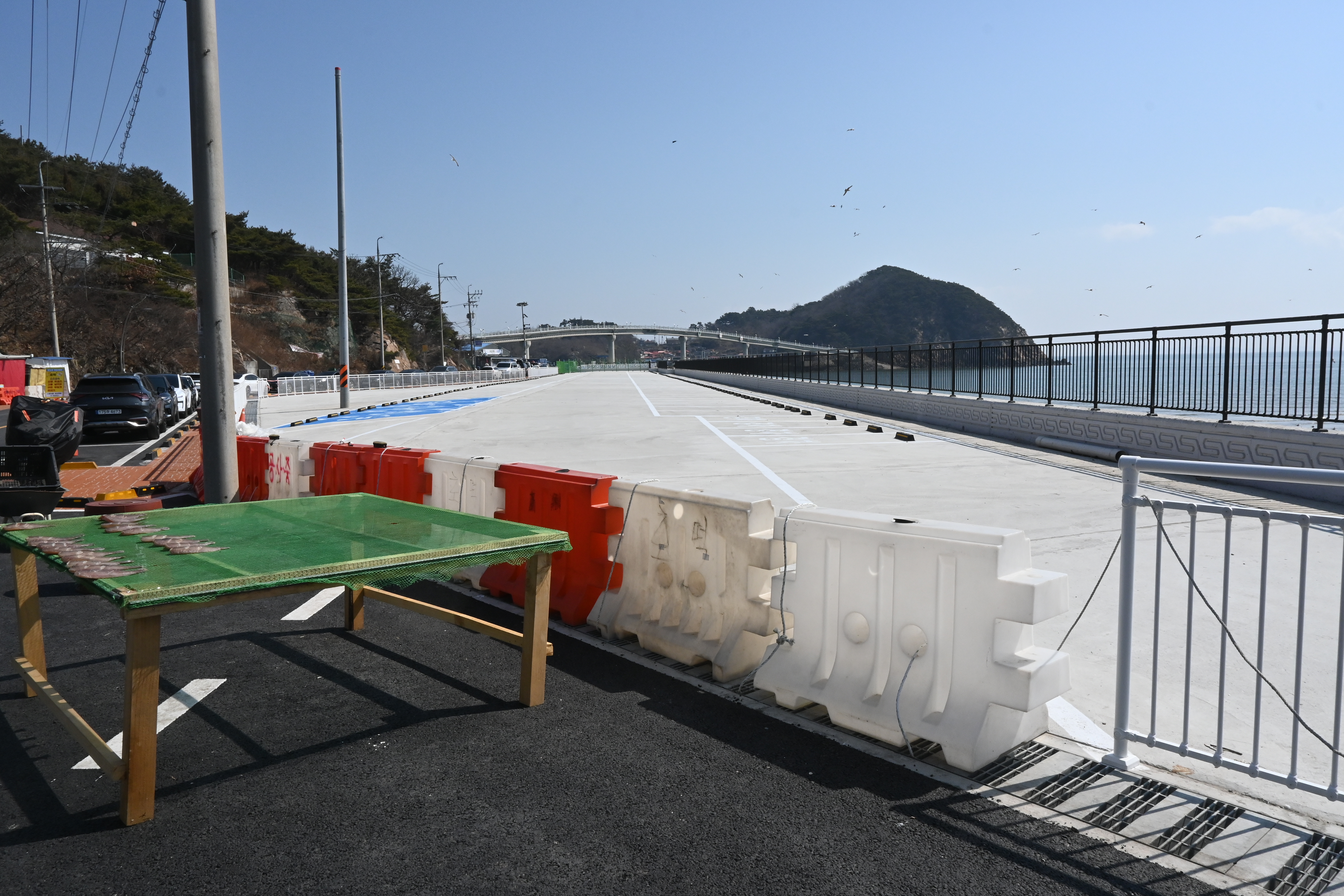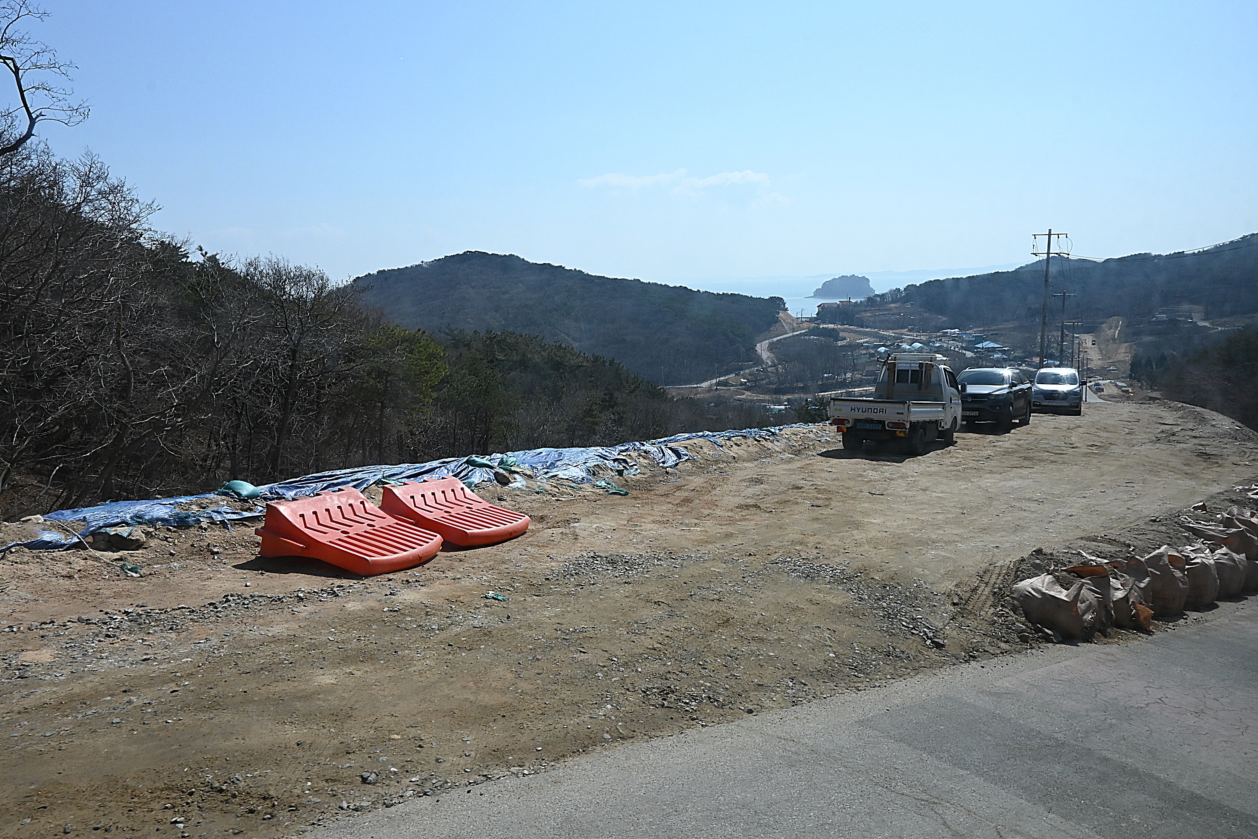 광명항으로 넘어가는 고개가 보이고 있다. 도로 작업 중 어수선 하다.