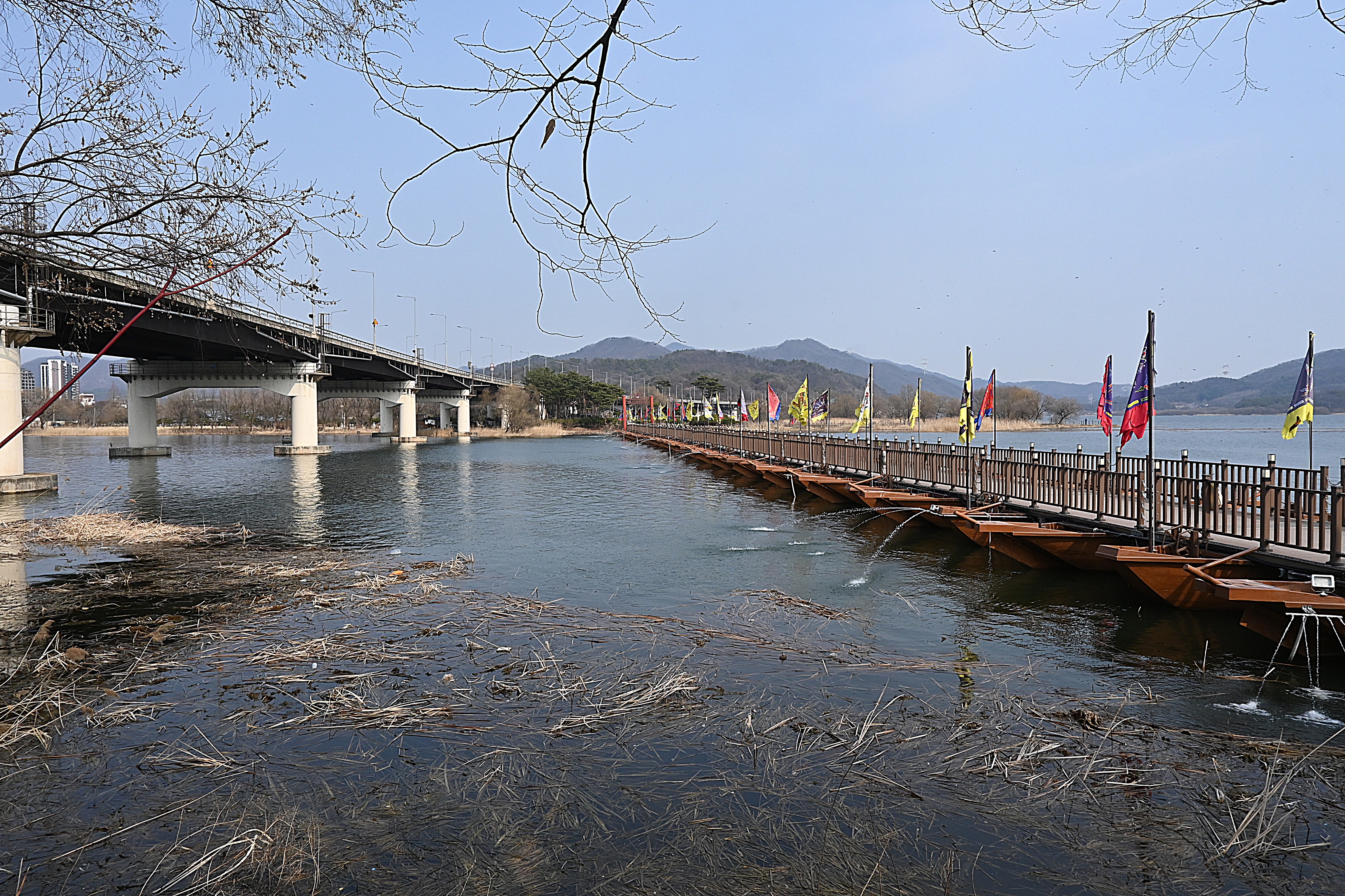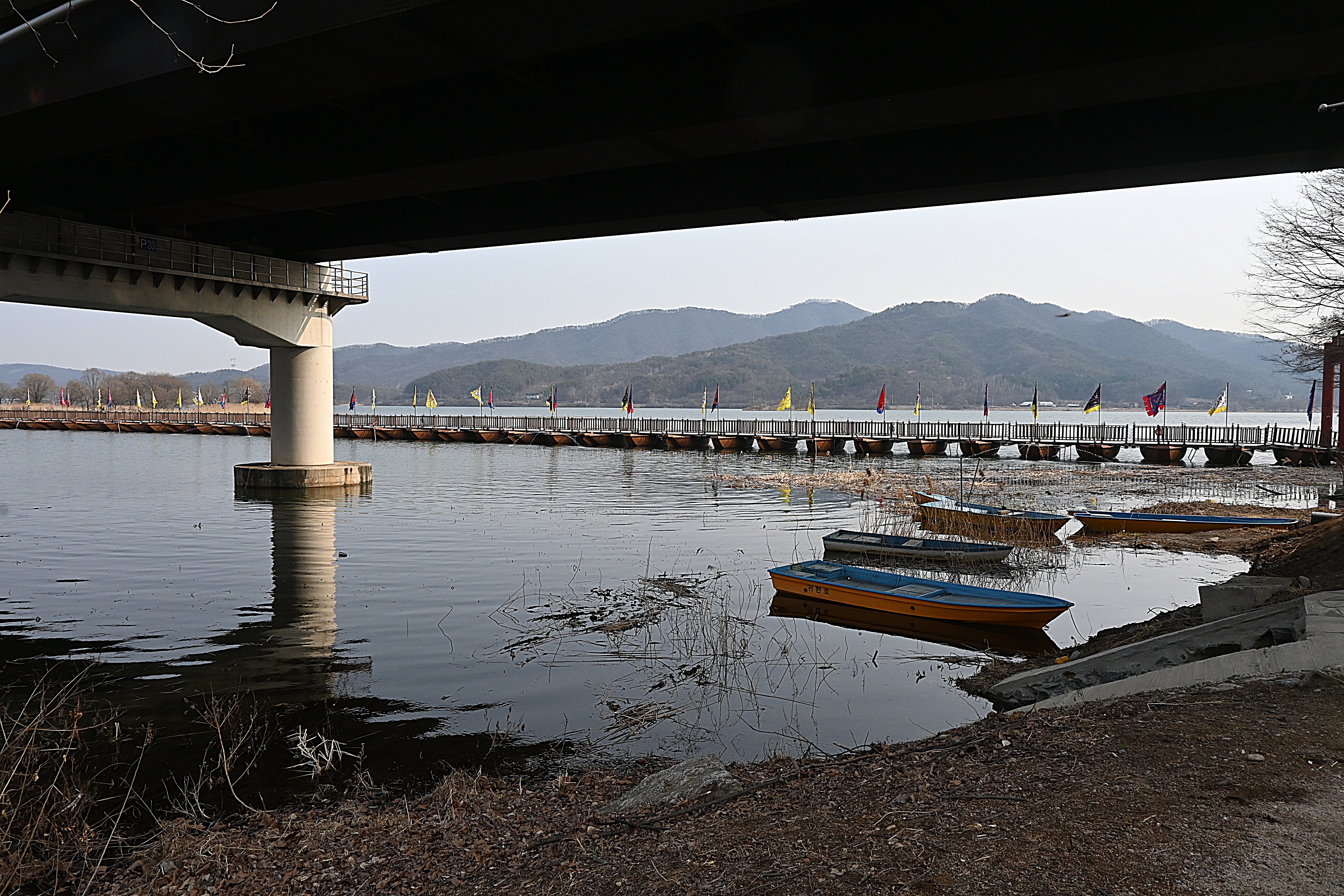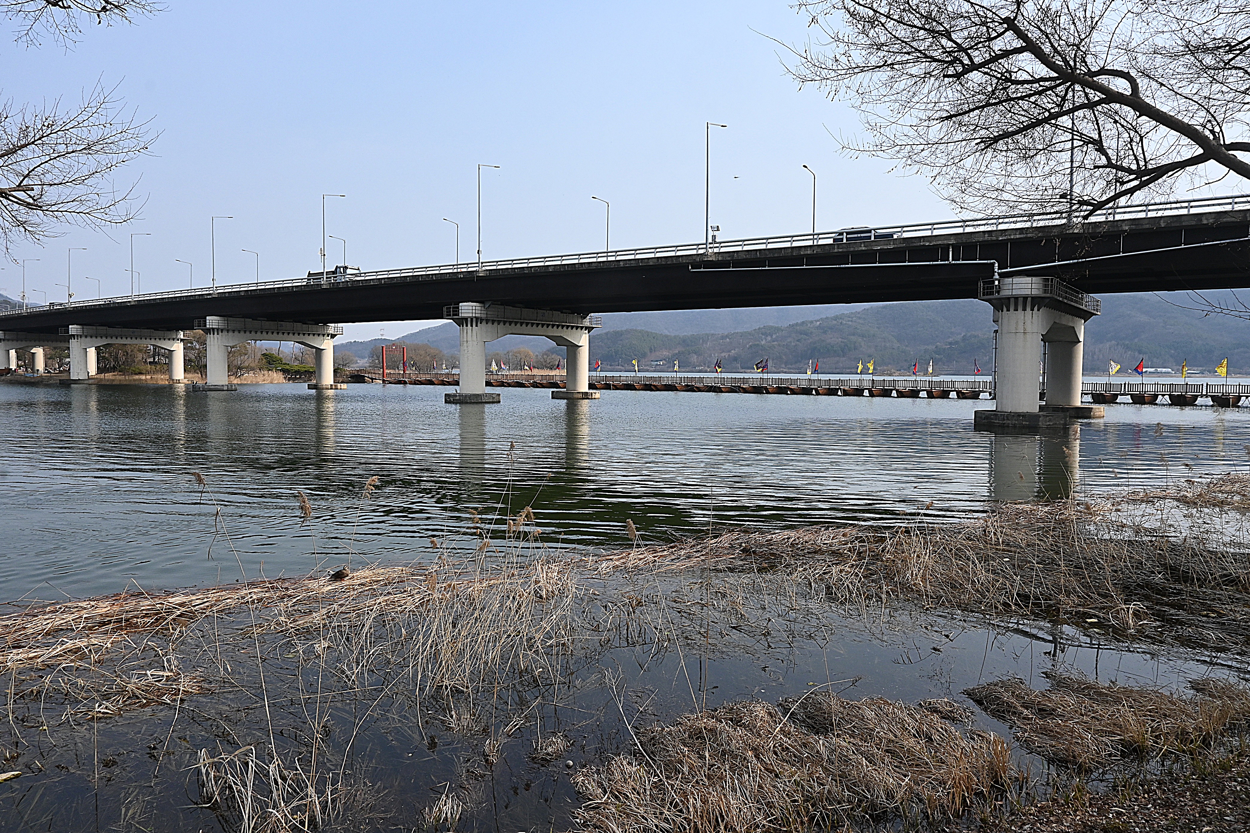 신양수대교, 배다리, 호수 건너 멀리 해협산, 정광산