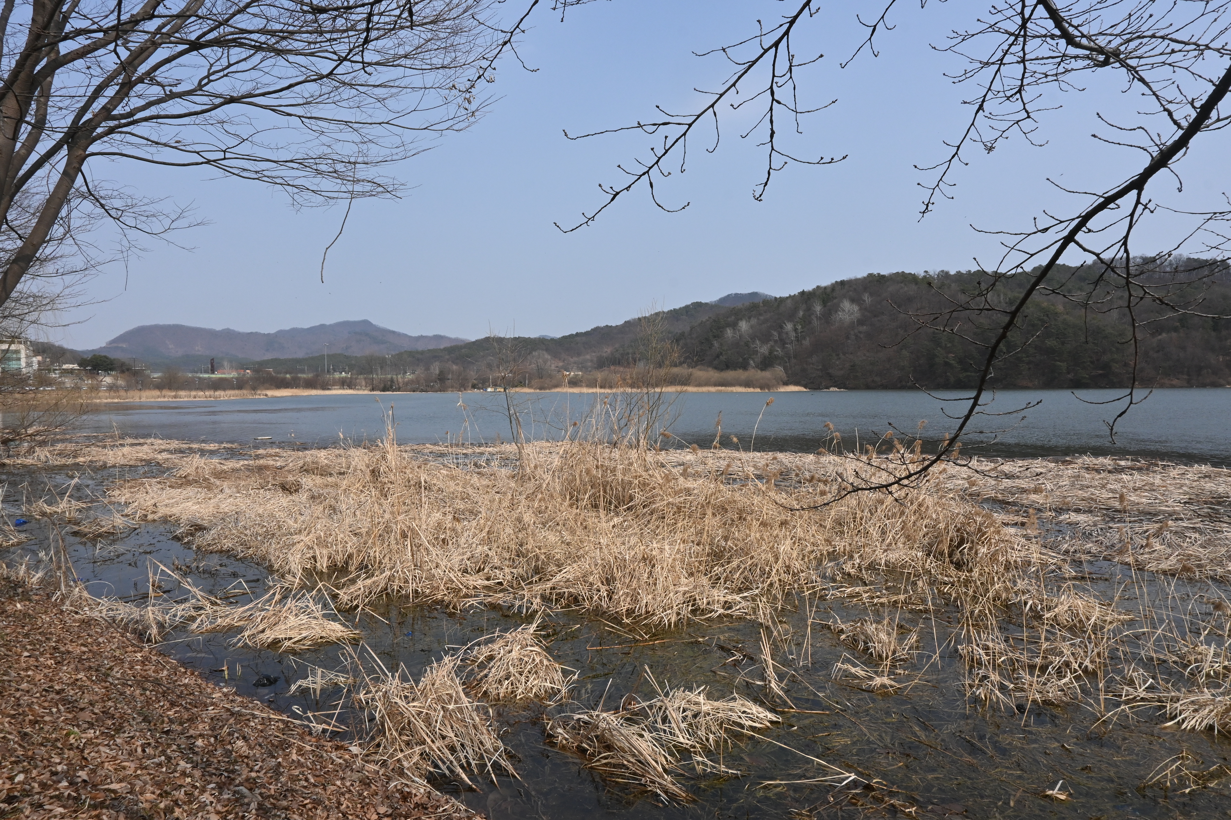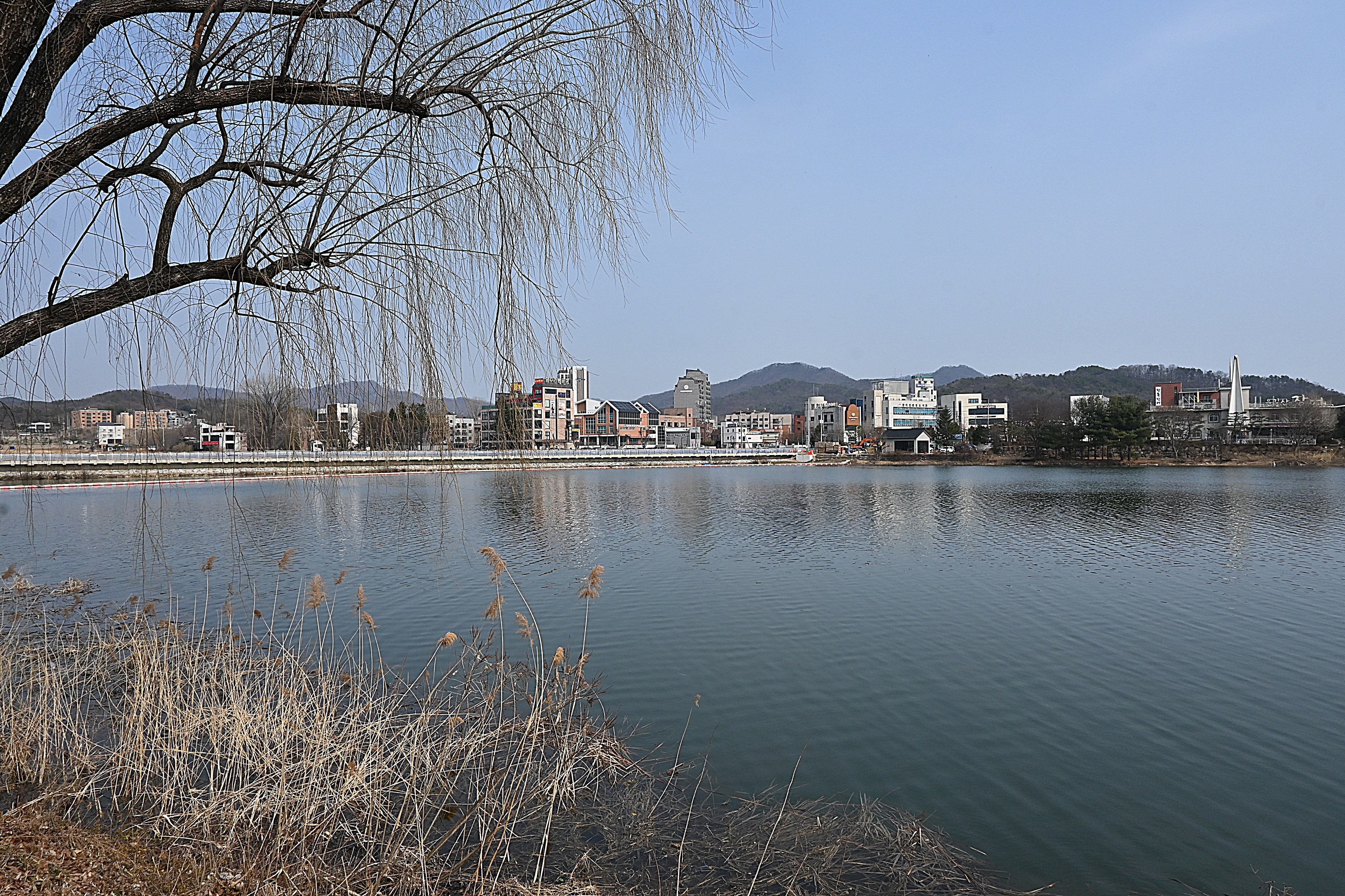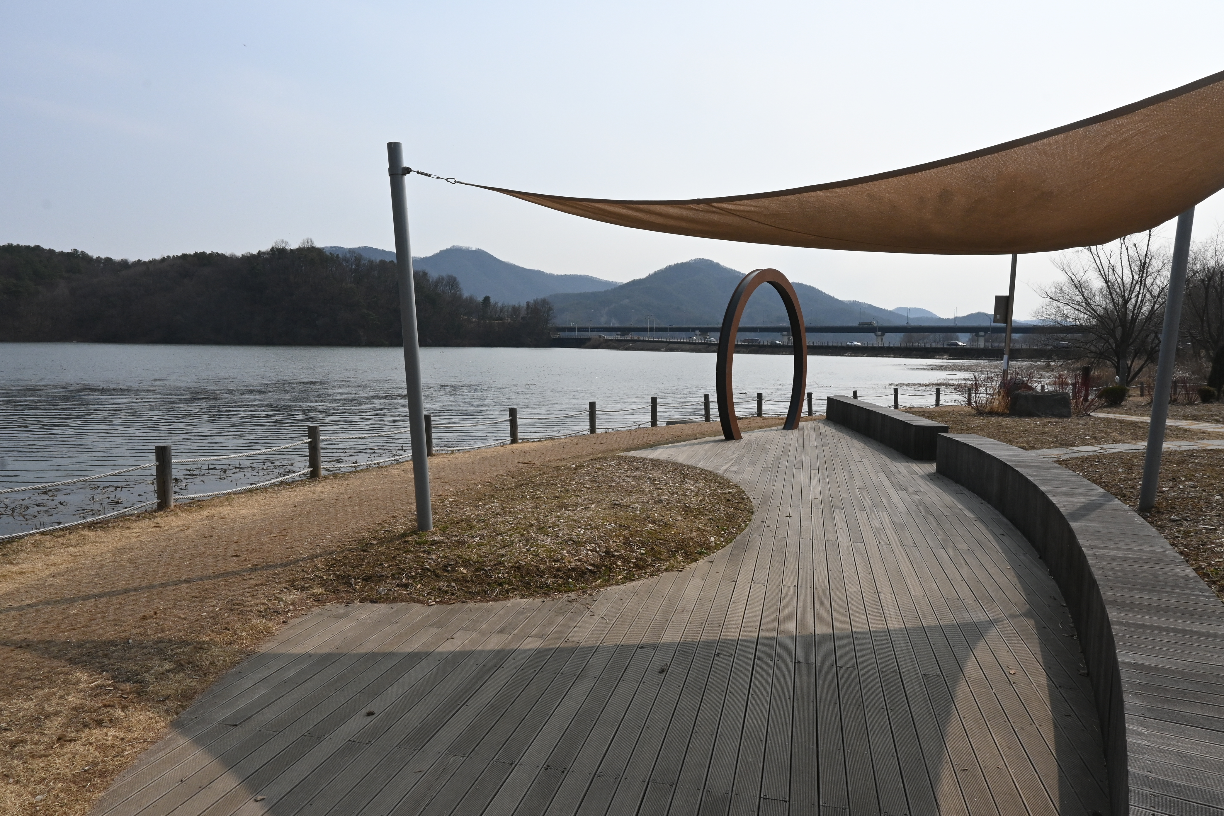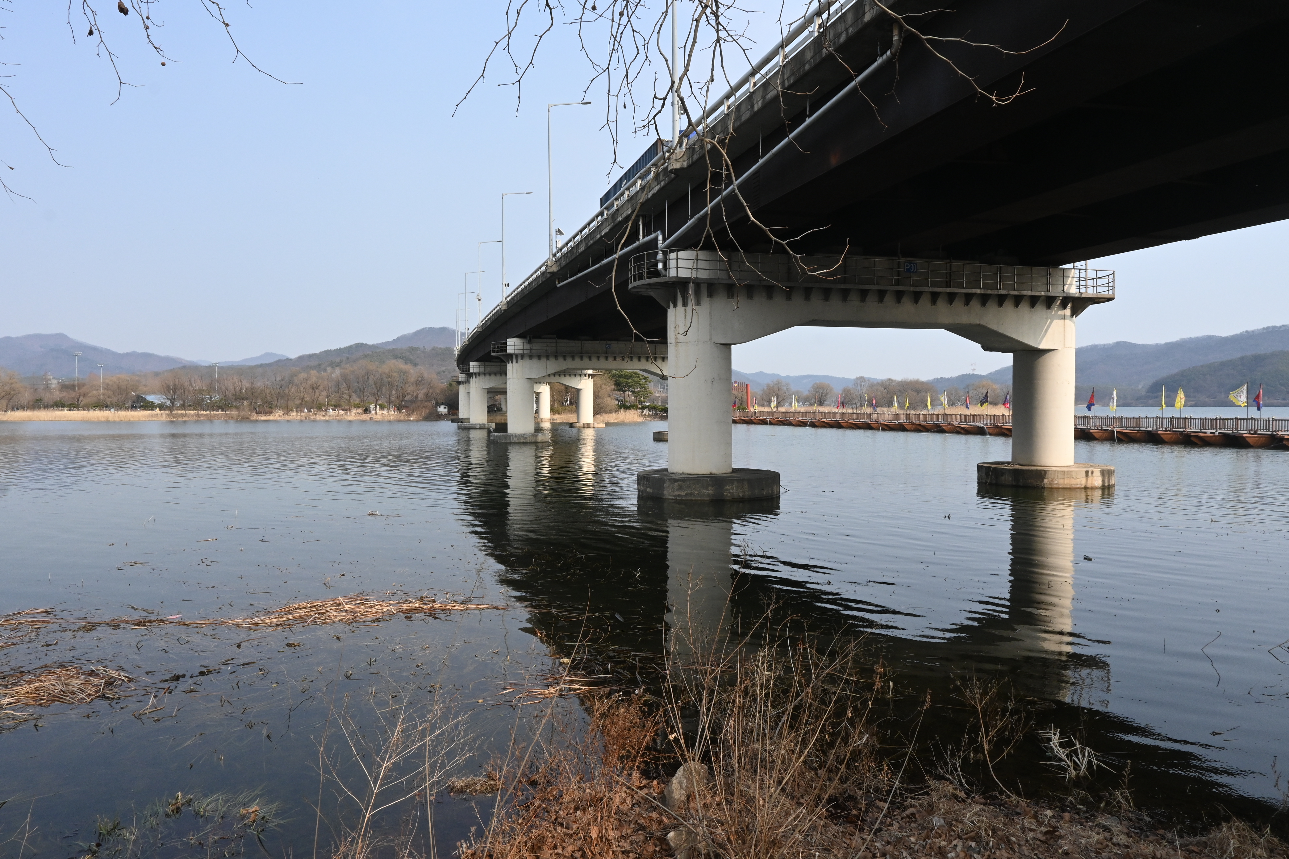 신양수대교, 배다리, 호수 건너 멀리 해협산, 정광산