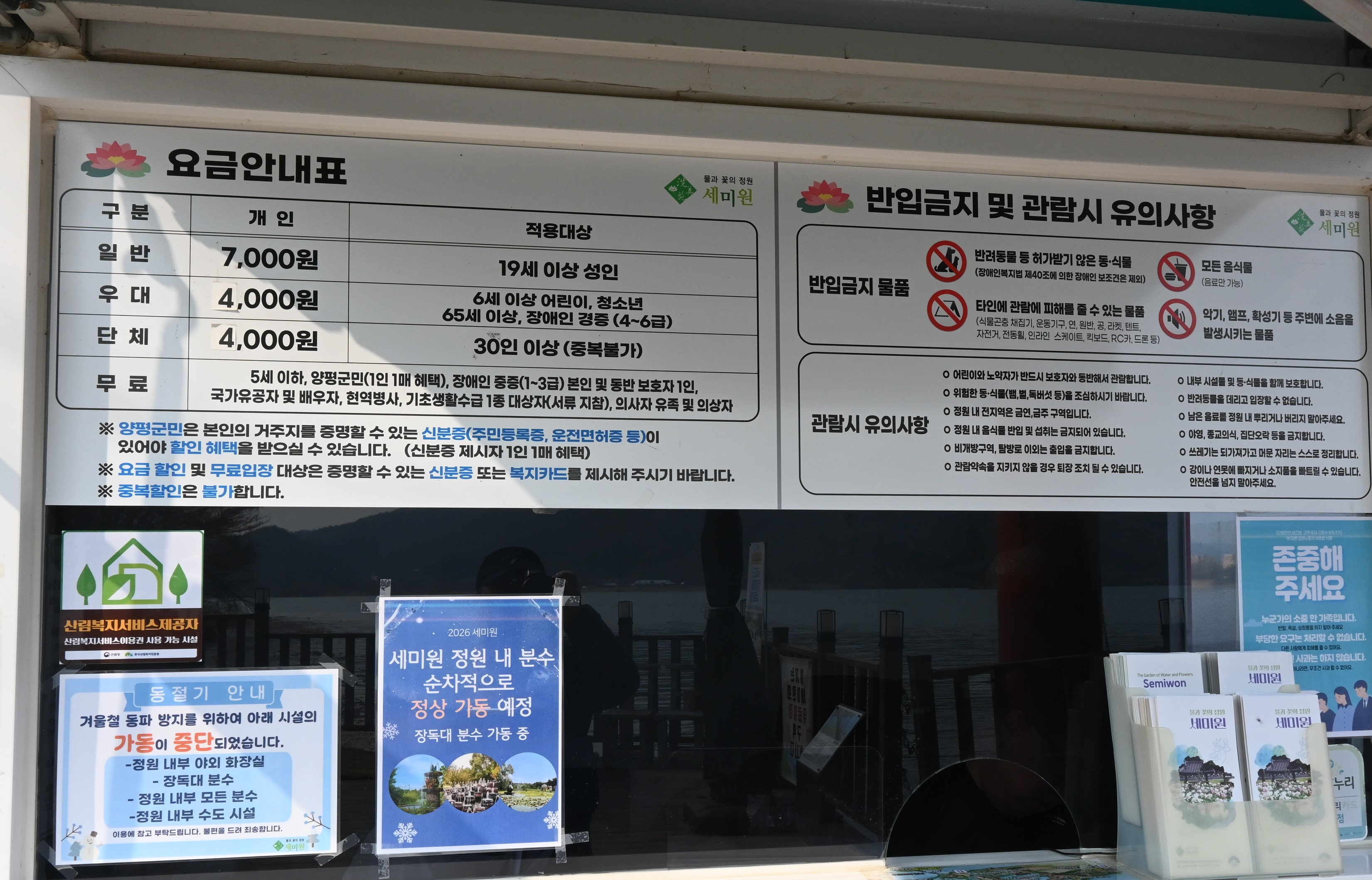 - 무료: 5세 이하, 양평군민, 국가유공자 및 배우자, 기초생활수급 1종 대상자, 의사자 유족 및 의상자.