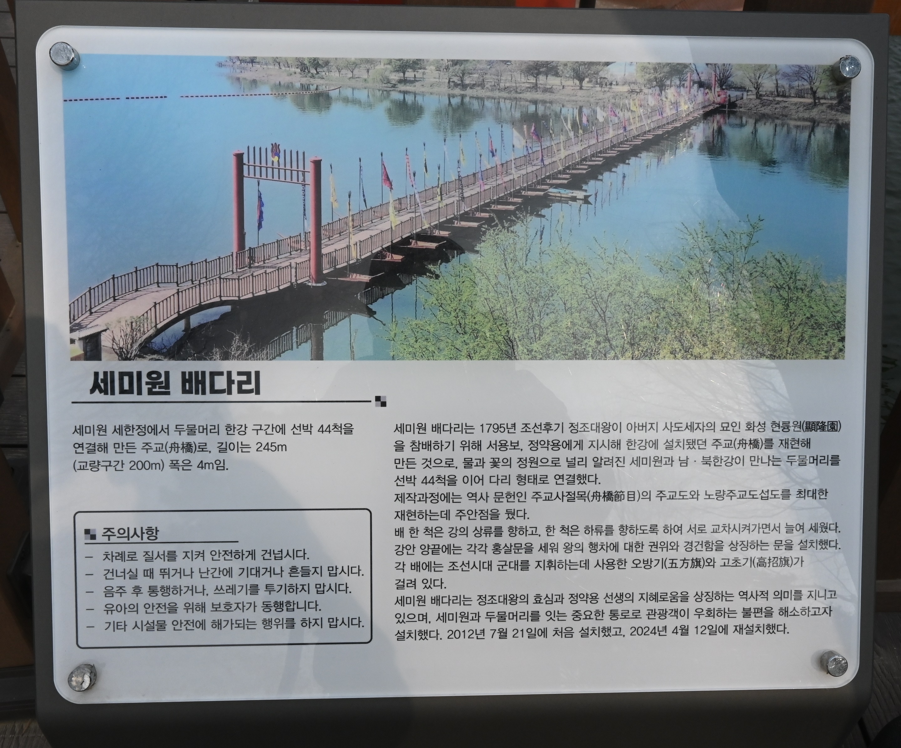 세미원 세한정에서 두물머리 한강 구간에 선박 44척을 연결해 만든 주교(舟橋)로, 길이는 245m (교량구간 200m) 폭은 4m 임,
