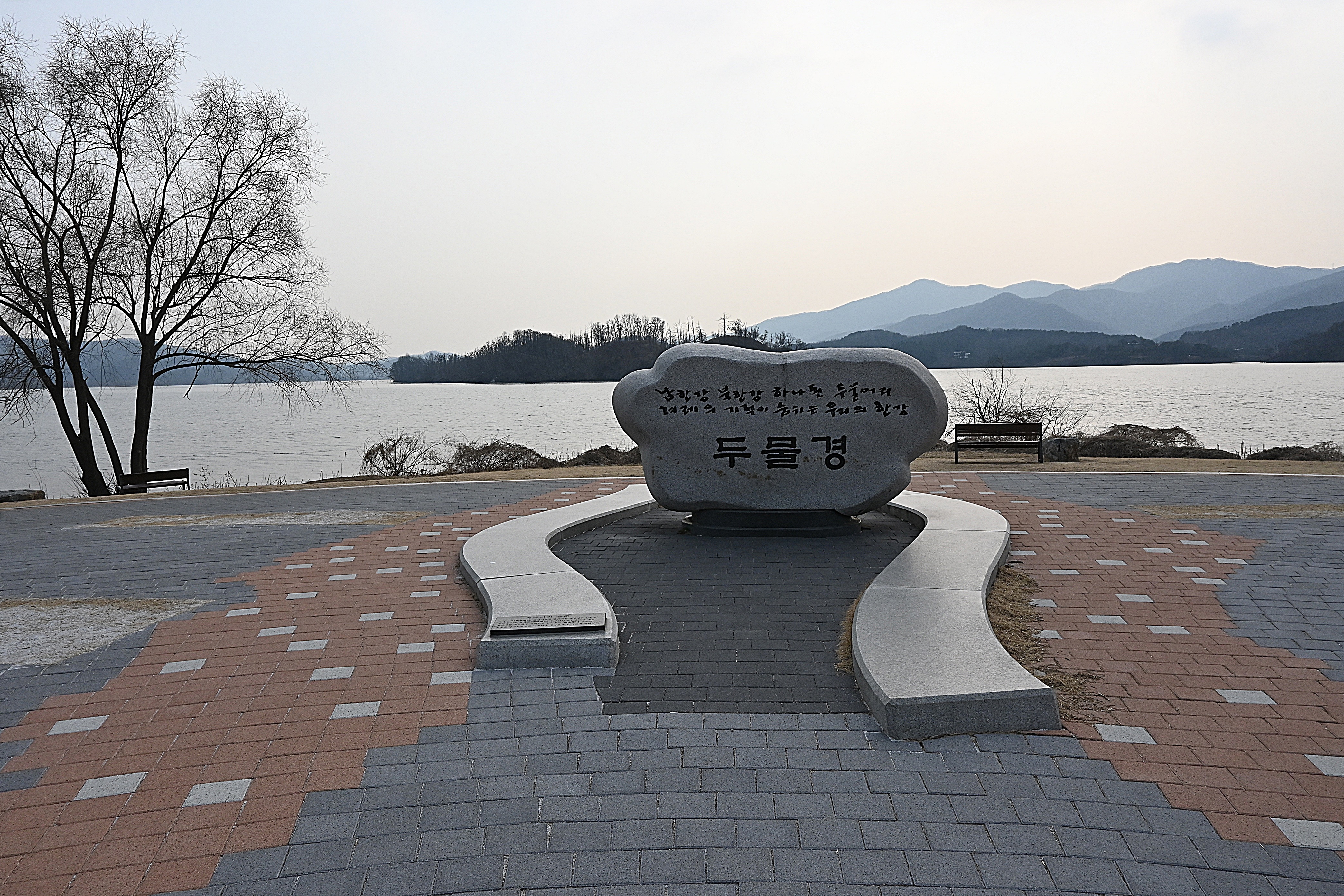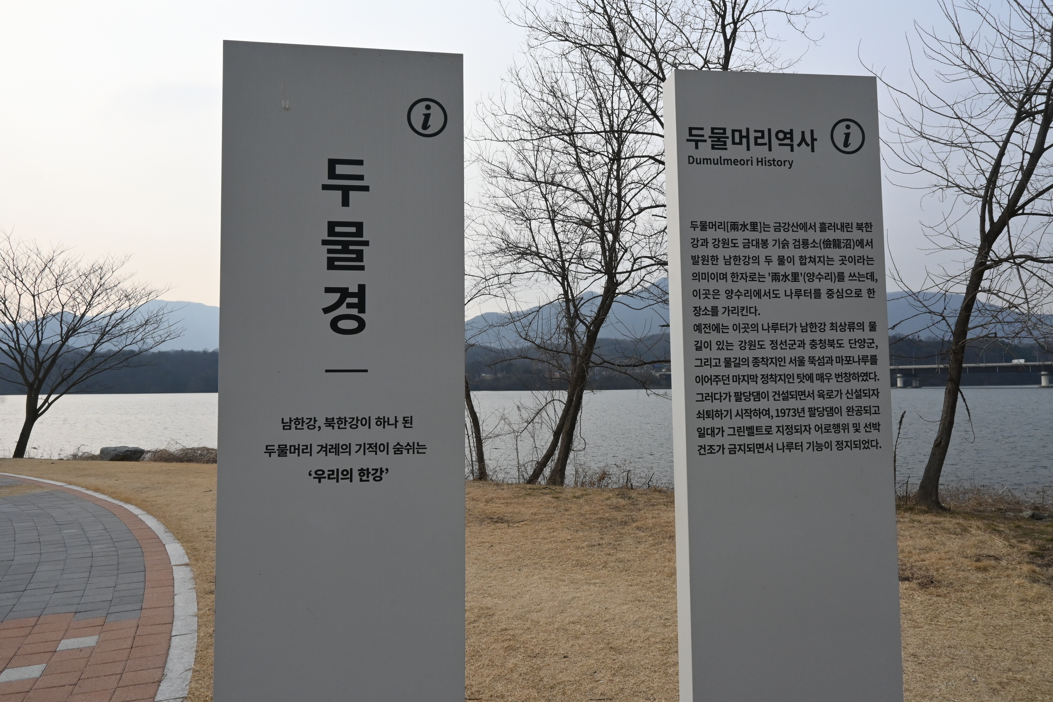 " 당신과 나, 우리의 만남이 아름다운 물안개 되어 피어오릅니다. " " 이 곳은 두물머리 물안개쉼터입니다. 두물머리는 아침 물안개가 특별히 아름다운 곳으로 드라마와 CF 촬영지. 두물머리 사진 작가들의 촬영명소로 많은 사랑을 받고 있습니다. 두물머리 물안개쉼터에서 잔잔한 강물 위로 피어오르는 물안개 풍경을 감삼해 보세요."
