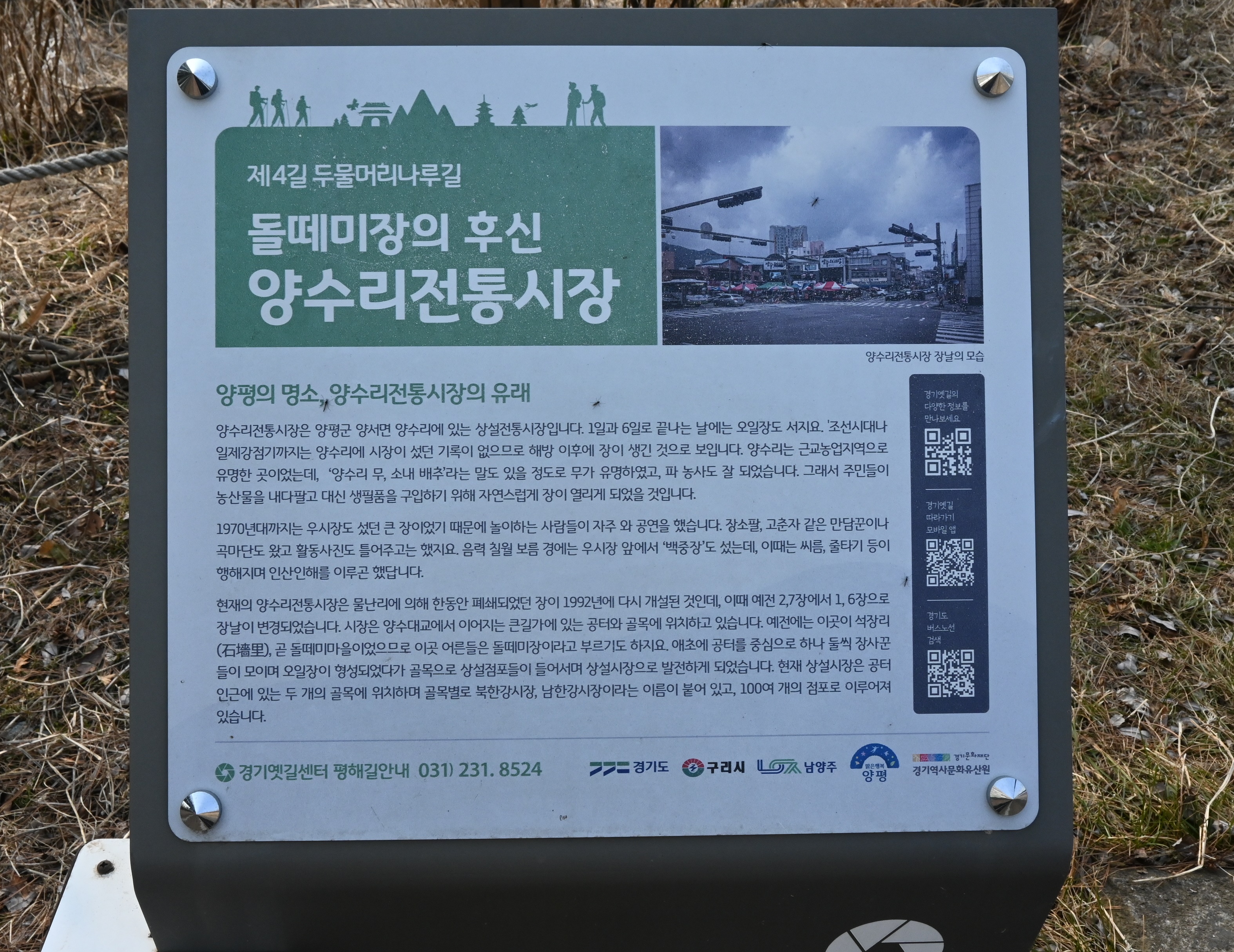 양수리전통시장은 양평군 양서면 양수리에 있는 상설전통시장입니다. 1일과 6일로 긑나는 날에는 오일장도 서지요. '조선시대'니 일제강점기 까지는 양수리에 시장이 섰던 기록이 없으므로 해방 이후에 장이 생긴 것으로 보입니다. 양수리는 근교 농업지역으로 우명한 곳이었는데, "양수리 무, 소내 배추"라는 말도 있을 정도로 무가 유명하였고, 파 농사도 잘 되었습니다. 그래서 주민들이 농산물을 내다팔고 대신 생필품을 구입하기 위해 자연스럽게 장이 열리게 되었을 것입니다. 1970년대 까지는 우시장도 섰던 큰 장이었기 때문에 놀이하는 사람들이 자주 와 공연을 했습니다. 장소팔, 고춘자 같은 만담꾼이나 곡마단도 왔고 활동사진도 틀어 주곤 했지요. 음력 칠월 보름경에는 우시장 앞에서 '백중장'도 섰는데, 이 때는 씨름, 줄다리기 등이 행해지며 인산인해를 이루곤 했답니다. 현재의 양수리 전통시장은 물난리에 한동안 폐쇄되었던 장이 1992년에 다시 개설된 것인데, 이때 예전 2,7장에서 1,6장으로 장날이 변경되었습니다. 시장은 양수대교에서 이어지는 큰길가에 있는 공터와 골목에 위치하고 있습니다. 예전에는 이곳에 석장리(石墻里), 곧 돌떼미마을이었으므로 이곳 어른들은 돌떼미장이라고 부르기도 하지요. 애초에 공터를 중심으로 하나 둘씩 장사꾼들이 모이며 오일장이 형성되었다가 골목으로 상설점포들이 들어서며 상설시장으로 발전하게 되었습니다. 현재 상설시장은 공터 인근에 있는 두개의 골목에 위치하며 골목별로 북한강시장, 남한강시장이라는 이름이 붙어 있고, 100여개의 점포로 이루어져있습니다. 평해길 안내 경기옛길 센터 031.231.8524. 양평군 031.770.2455
